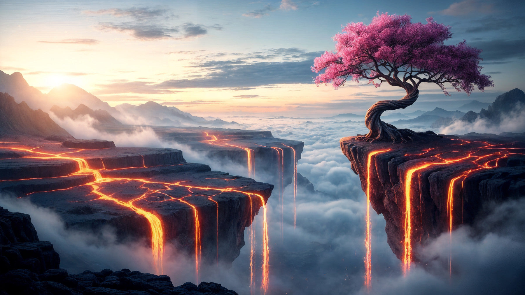 Transform your living space with this captivating vista! The wallpaper for walls depicts a surreal landscape where fiery streams meet a sky painted with soft hues. A vibrant, blossoming tree stands as a focal point, lending an air of tranquility and wonder. The contrast between the warm orange glow and the cool misty backdrop adds depth and dimension to any room. Ideal for a living room, bedroom, or study, this design creates an immersive atmosphere, turning your wall into a breathtaking vista. Bring nature's drama and serenity into your home with this unique statement piece.