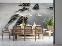 Envelop your walls with an ethereal elegance. Jagged, monolithic crags pierce through a sea of dreamy fog, rendered in striking monochrome. This black and white wallpaper for walls adds a unique, dramatic touch to any space. The detailed texture of the stone combines with the soft mist creating a captivating visual interest. The design is ideal for an entryway, study, or living room, lending a peaceful yet grand appeal. Its calming effect complements modern and sophisticated interiors.