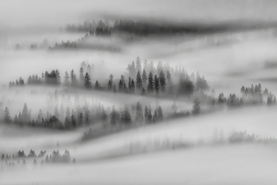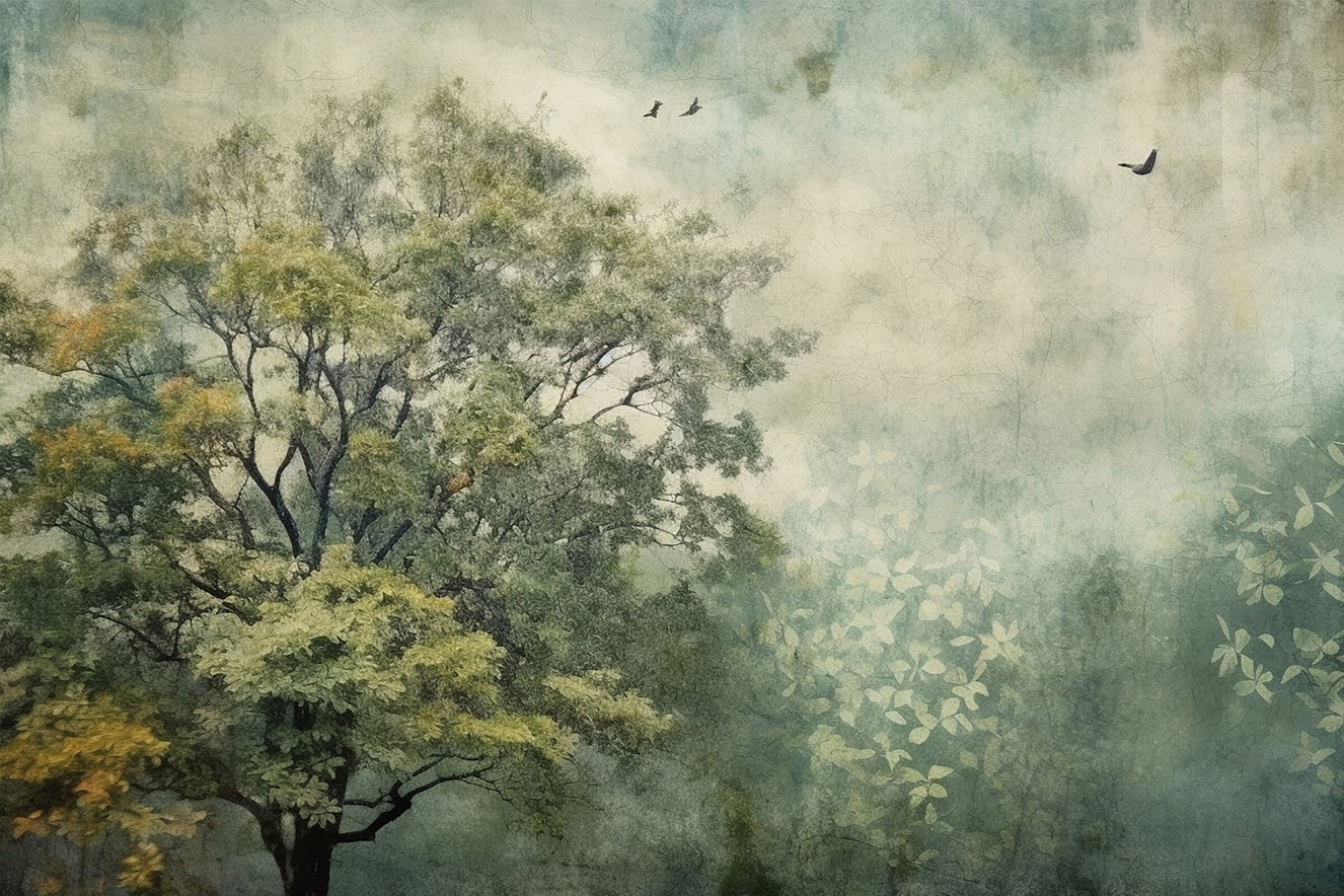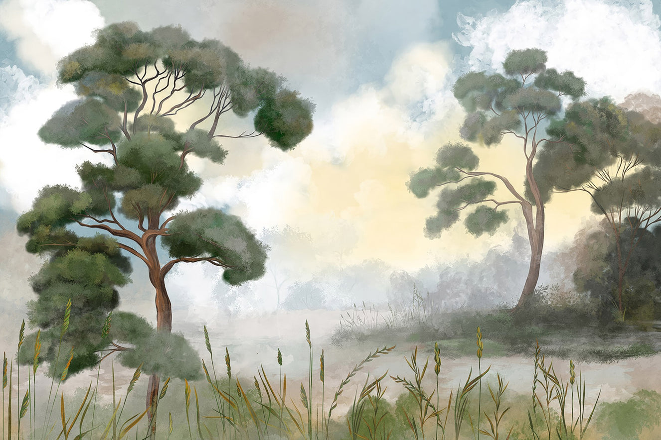 This stunning art piece presents a mesmerising view of a forest illuminated by soft, diffused light. The abstract composition reveals a blend of colours that evoke a sense of tranquillity and wonder.