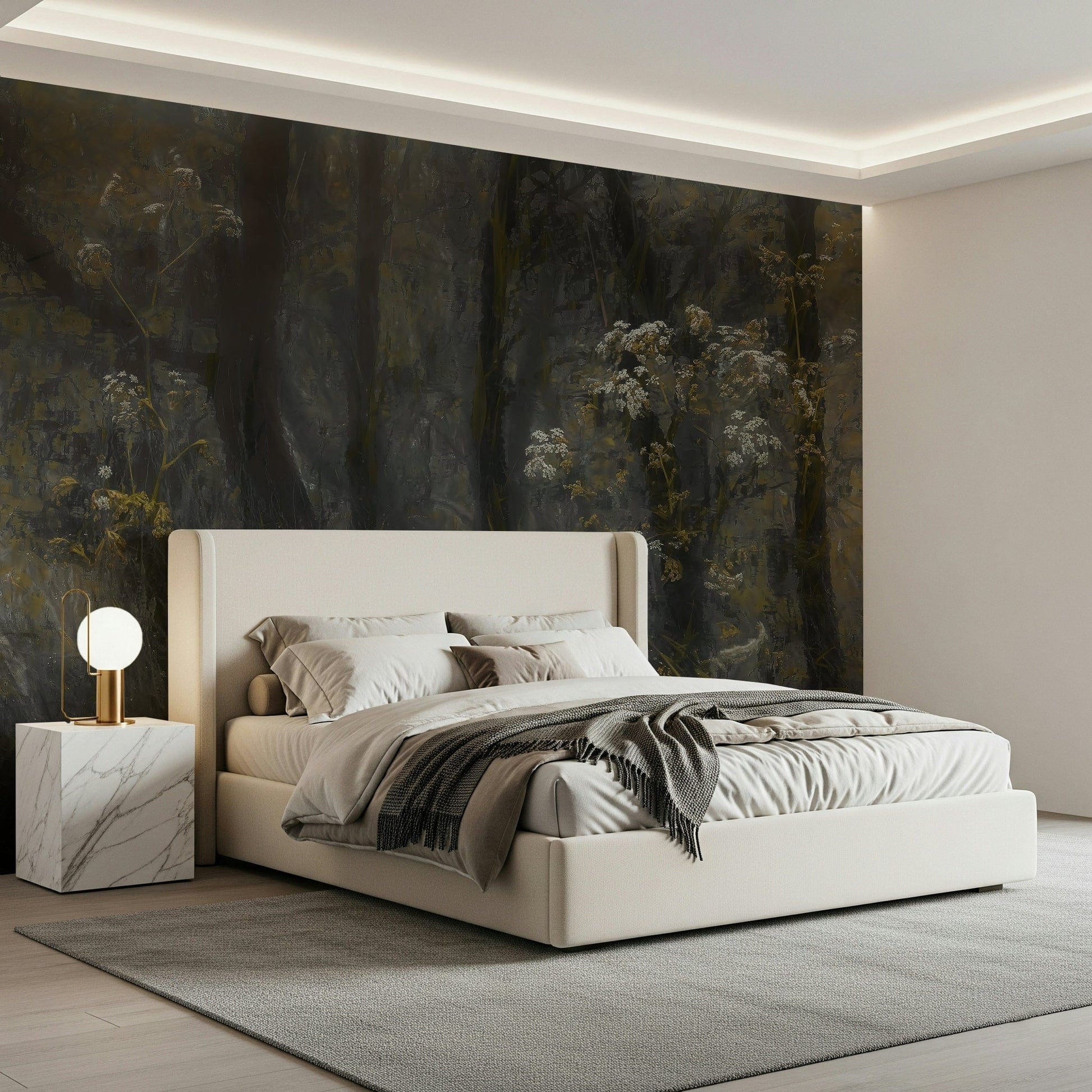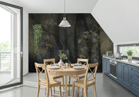 Transform your space with this evocative wallpaper for walls. It presents a stylised forest scene, with touches of white and yellow florals against a dark, muted backdrop. The design lends a tranquil and sophisticated mood, working particularly well in living rooms, bedrooms, or hallways where you want to create a serene atmosphere. The subtle colour palette ensures it integrates beautifully, adding texture and depth without overwhelming the existing decor. This design brings the quiet beauty of nature indoors.