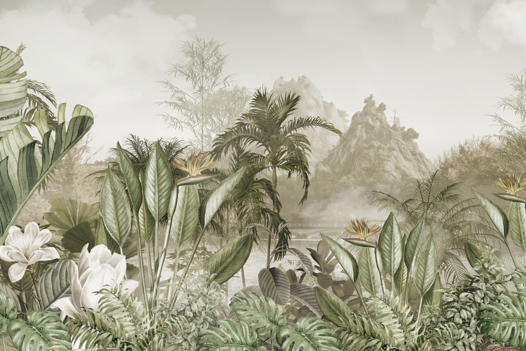 Dreamy ethereal jungle panorama mural wallpaper for serene bedrooms.