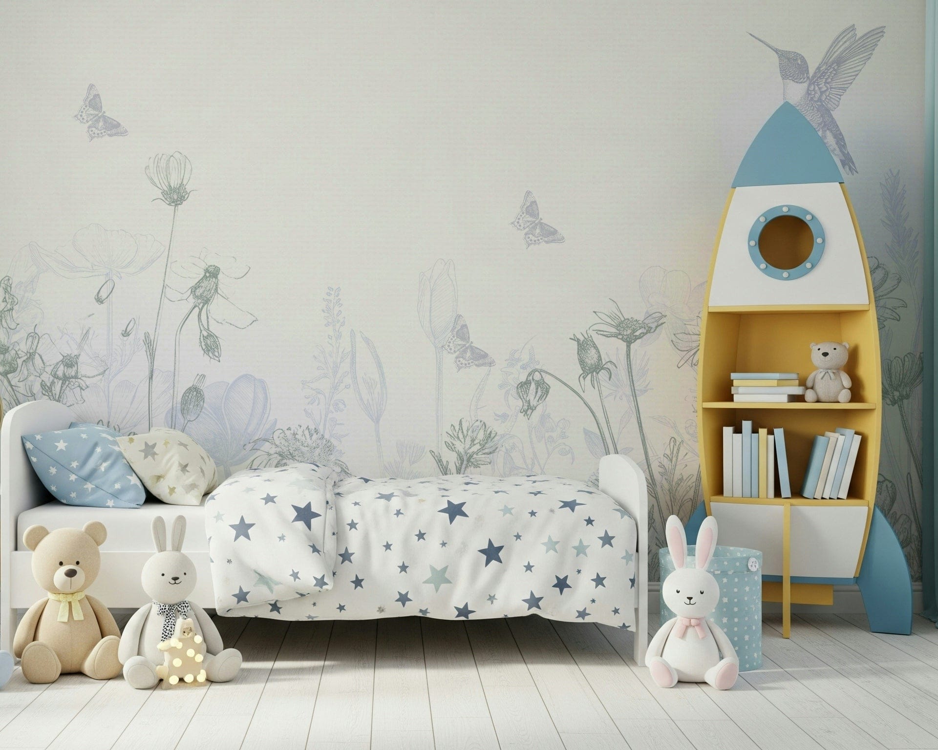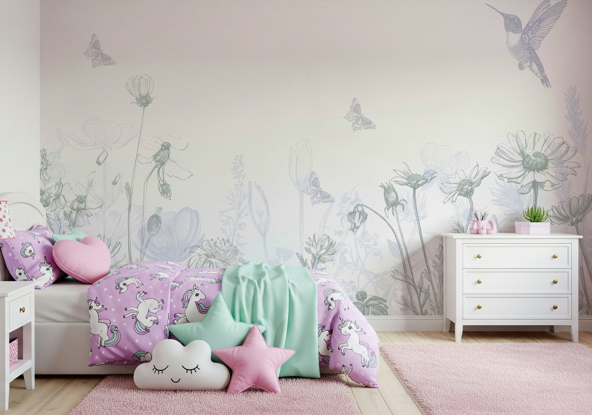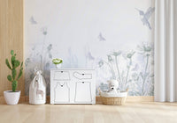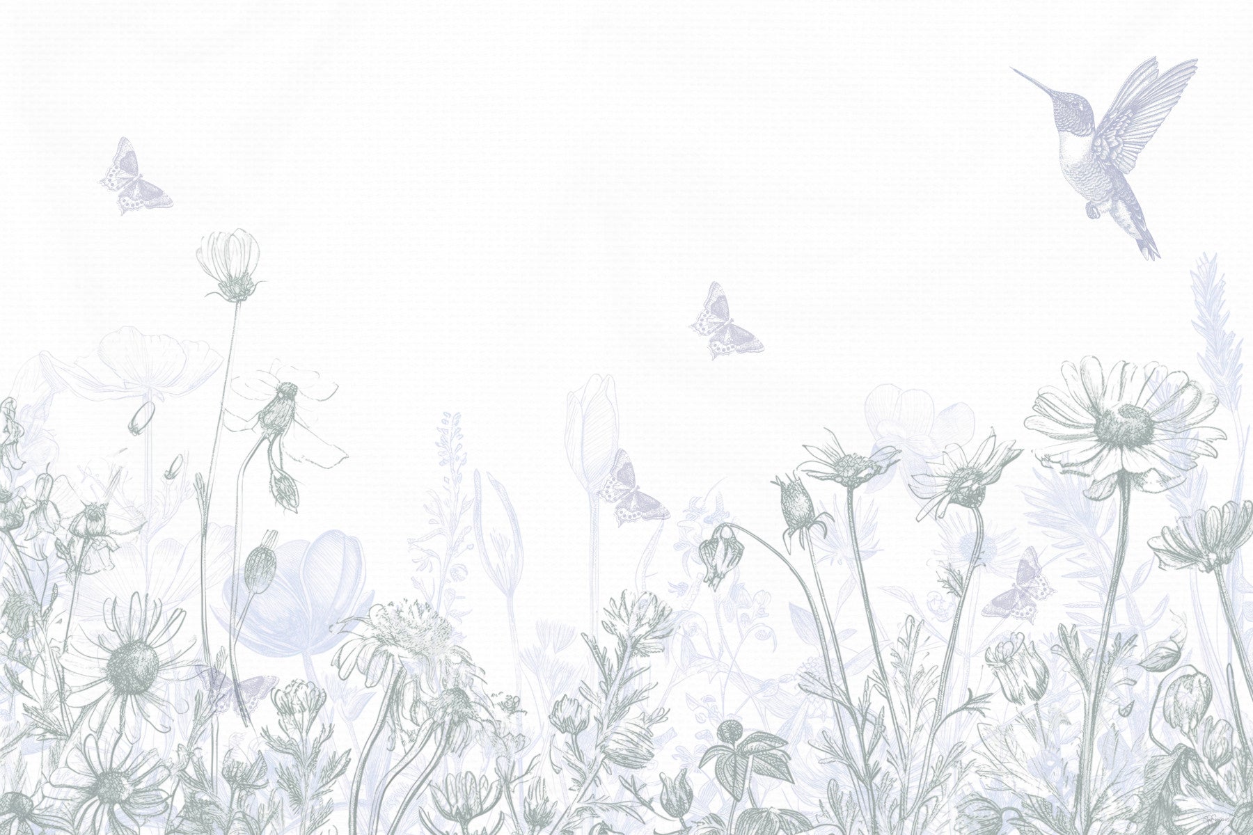 Bring a serene garden indoors with this delicate floral wallpaper for walls. The subtle grey and blue tones create a peaceful atmosphere, showcasing hummingbirds and butterflies among wildflowers. This understated design, featuring fine line art, makes it ideal for bedrooms, nurseries, or any space where you want to establish a calming retreat. The gentle tones of the wallpaper complement interiors with a clean and airy aesthetic, seamlessly blending nature's tranquility into your home.