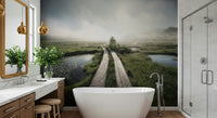 Step into serenity with this landscape. A misty field, a serene path, and gentle colours create a calm view. The wooden path draws the eye, offering a journey through nature. Consider this design as wallpaper for walls to bring a touch of natural peace indoors. It's great for living rooms, bedrooms, or offices. This design brings a tranquil touch to any interior.
