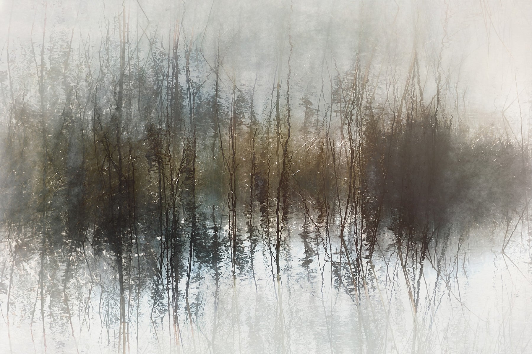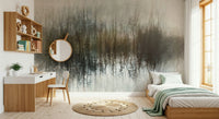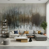 This wallpaper evokes a sense of calm. The image presents a foggy forest reflected in water, offering a tranquil, almost dreamlike effect. Shades of grey, beige, and blue blend to create a soothing palette. Install this wallpaper for walls in a bedroom or living room to promote relaxation. The fluid lines of the trees and their reflections generate depth and visual interest, suiting minimalist or modern interiors.