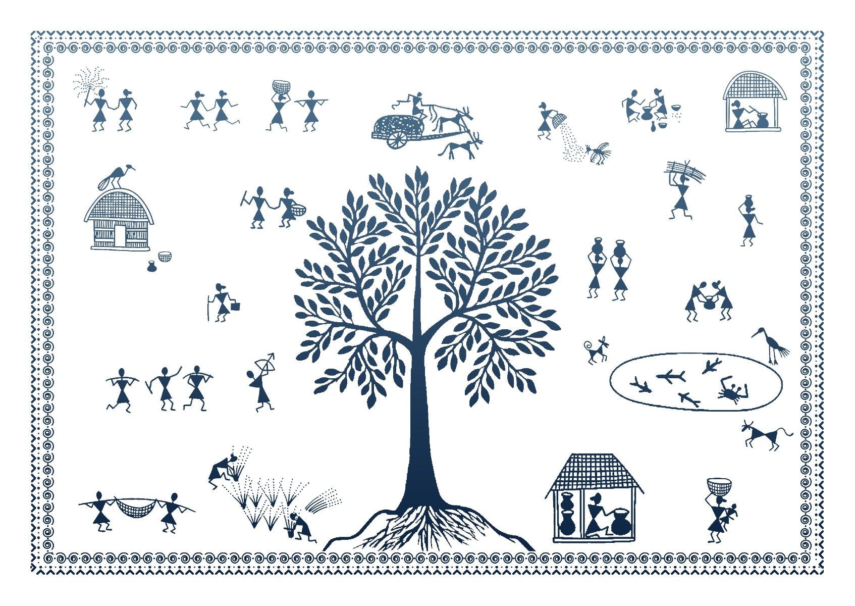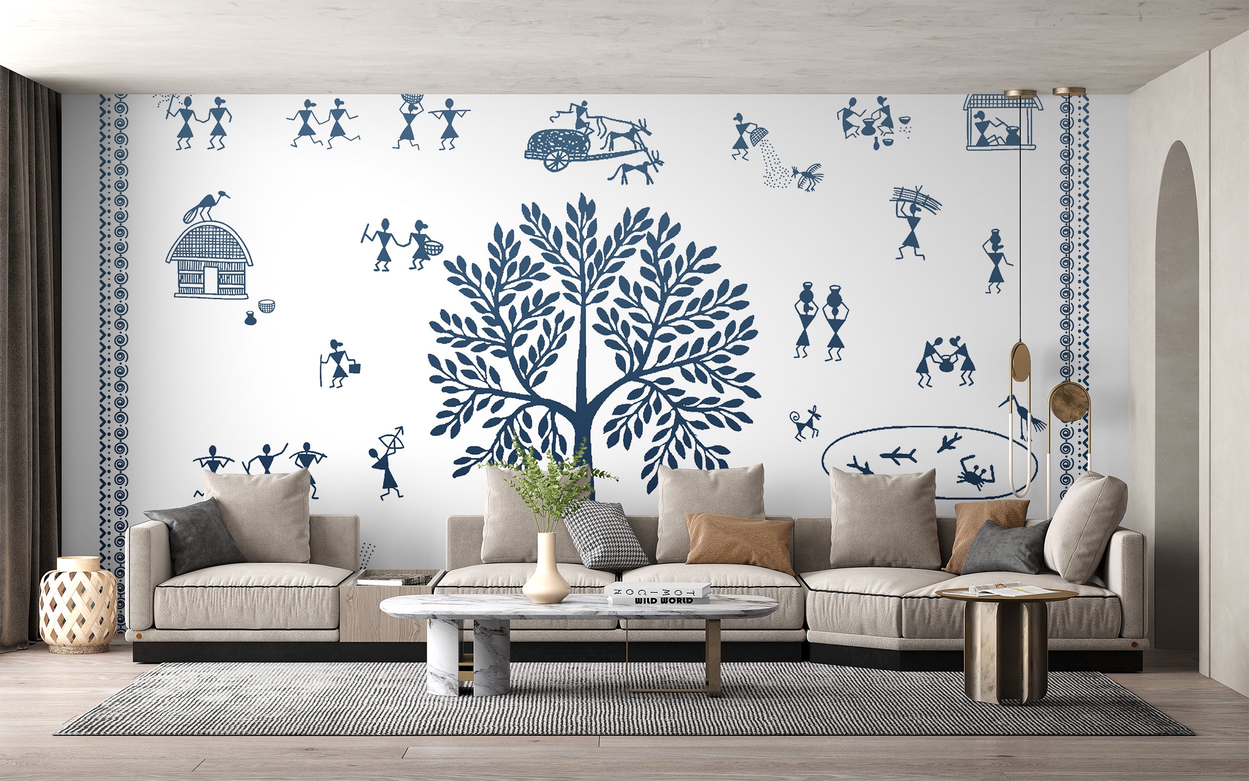 Step into a narrative woven through time with the ethnic village wallpaper mural. This wallpaper for walls is a picturesque portrayal of communal harmony, featuring scenes of daily life in the Warli style. Each frame tells a story of age-old traditions, with a grand Tree of Life as its centrepiece, symbolizing growth and connectivity. The detailed border frames the mural, inviting viewers on a visual journey through the rhythms of rural life. Whether it's for a living room or a study, this wallpaper mural adds a touch of cultural richness, making it more than just a piece of decor but a homage to a timeless art form. Celebrate heritage and create a focal point that's both artful and conversation-inspiring with the ethnic village wallpaper mural.