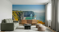 Transform your space with this stunning wallpaper for walls, showcasing the iconic cliffs of Étretat bathed in sunlight. Golden wildflowers highlight the foreground, contrasting beautifully with the blue sea. This panoramic view instantly opens up smaller rooms, bringing a sense of vastness and tranquility to your interior design. The vibrant yellow flowers introduce a cheerful element, brightening any space, while the natural stone texture of the cliffs adds depth and sophistication. Ideal for dining rooms, offices, or a feature wall in your living room, this wallpaper adds a touch of French coastal charm.