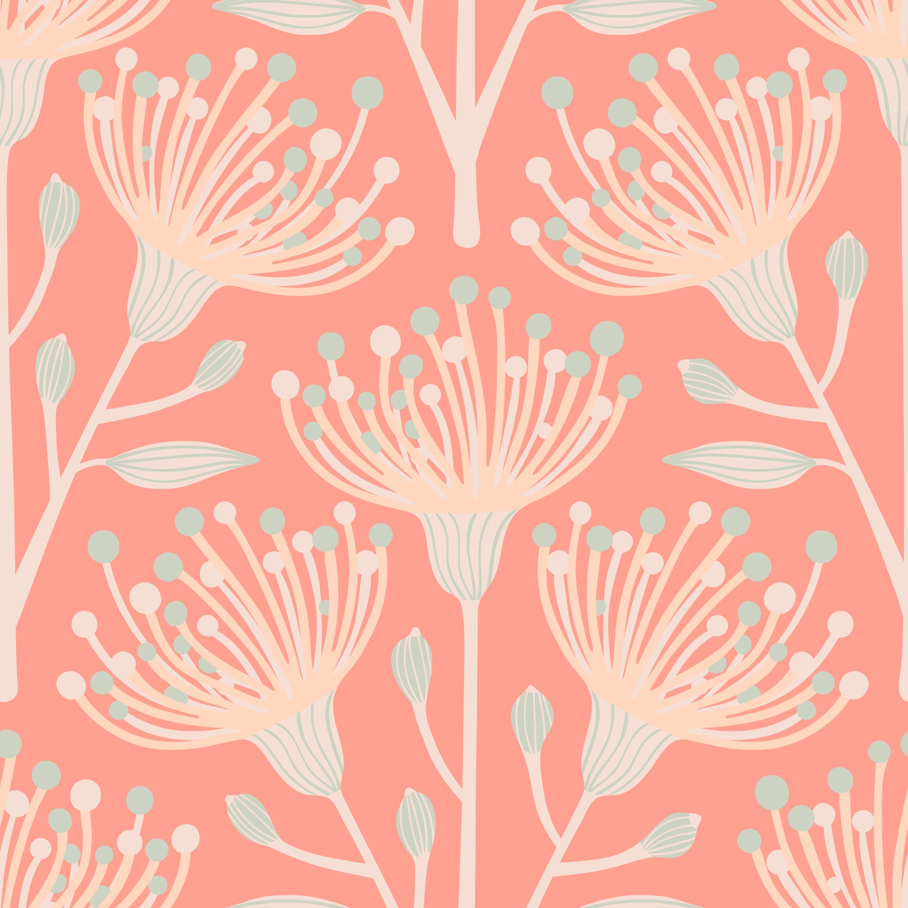 Embrace the serene beauty of nature with our Eucalyptus floral botanical design in pastel Cottage Blush on Apricot Orange. This delightful design marries the calming essence of eucalyptus with a charming cottage-inspired aesthetic, all set against a warm and inviting apricot orange backdrop. Delicate eucalyptus flowers create a balanced and harmonious pattern that evokes a sense of tranquility. The subtle blush tones add a touch of romantic elegance, enhancing the overall feeling of warmth and comfort. Perfect for creating a cozy and inviting atmosphere in any room, this wallpaper will transform your space into a botanical haven. Its soft color palette makes it a versatile choice, complementing a range of interior styles from rustic farmhouse to contemporary chic. This pattern design is also available in Other Colourways too! Original wallpaper pattern design by Jackie Tahara of UnBlink Studio.