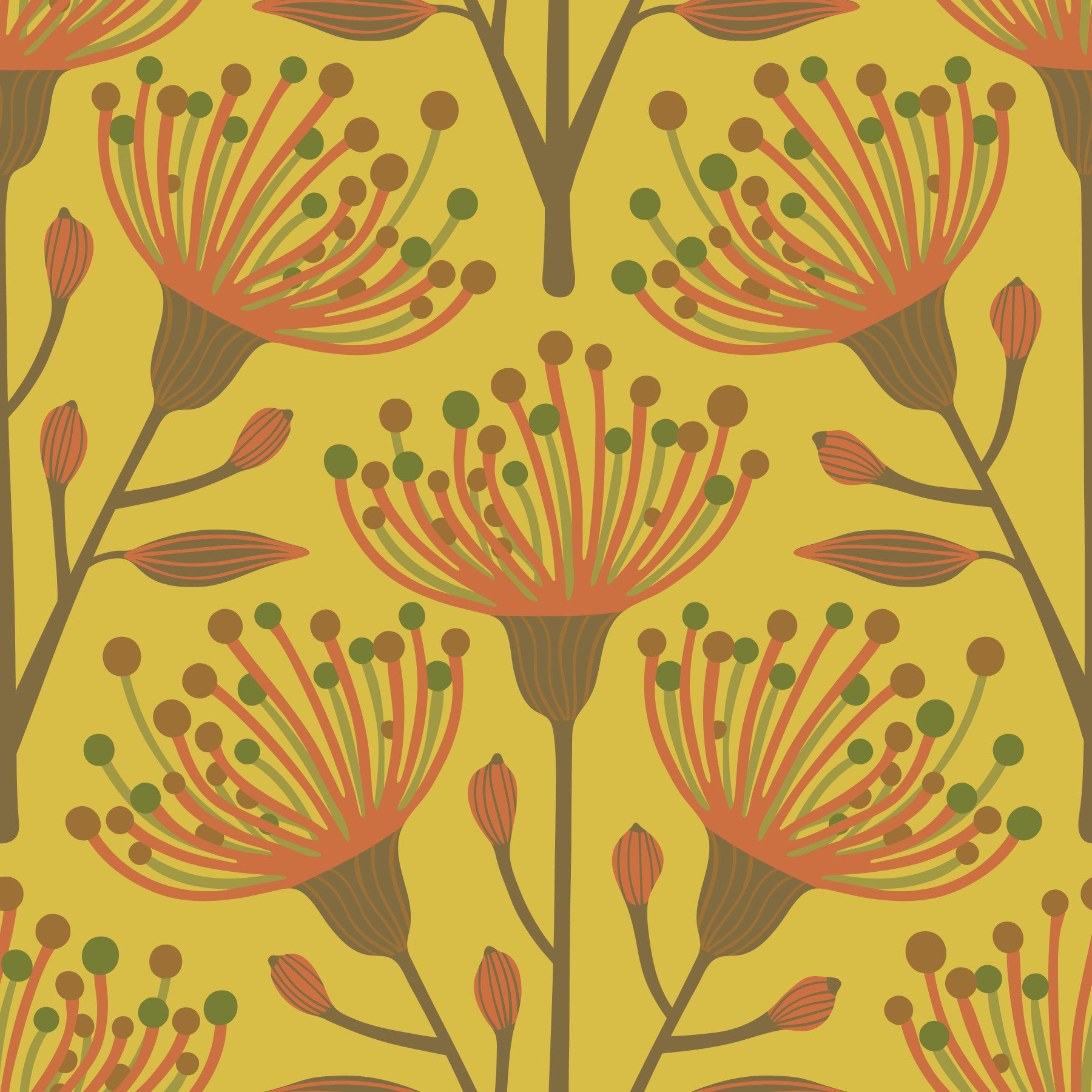Immerse yourself in the warming elegance of this Eucalyptus floral botanical wallpaper. Earthy browns and muted olive greens intermingle to create a calming and sophisticated aesthetic, reminiscent of a sun-drenched Australian landscape, all against a warm deep mustard yellow. The stylized delicate retro botanicals evoke a sense of tranquility and connection to nature. This wallpaper is perfect for creating a cozy and inviting atmosphere in any room, from living spaces to bedrooms. The design's harmonious color palette and balanced composition make it a versatile choice that complements a range of interior styles, adding a touch of understated luxury and botanical beauty to your home. Let the natural beauty of this design transform your space into a serene and stylish sanctuary. This pattern design is also available in Other Colourways too! Original wallpaper pattern design by Jackie Tahara of UnBlink Studio.
