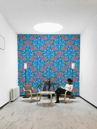 Immerse yourself in the vibrant energy of this striking "Eucalyptus" floral botanical wallpaper that bursts with life against a bright blue backdrop. This botanical pattern features stylised eucalyptus blooms in a captivating mix of light icy blue, bold red, cheerful yellow, and delicate pink hues. The interplay of colours creates a visually stunning and uplifting atmosphere, perfect for adding a touch of modern artistry to any space, and wonderful for those looking to introduce a burst of colour and character into their homes. This meticulously crafted botanical pattern offers a playful yet sophisticated charm. This pattern design is also available in Other Colourways too! Original wallpaper pattern design by Jackie Tahara of UnBlink Studio.