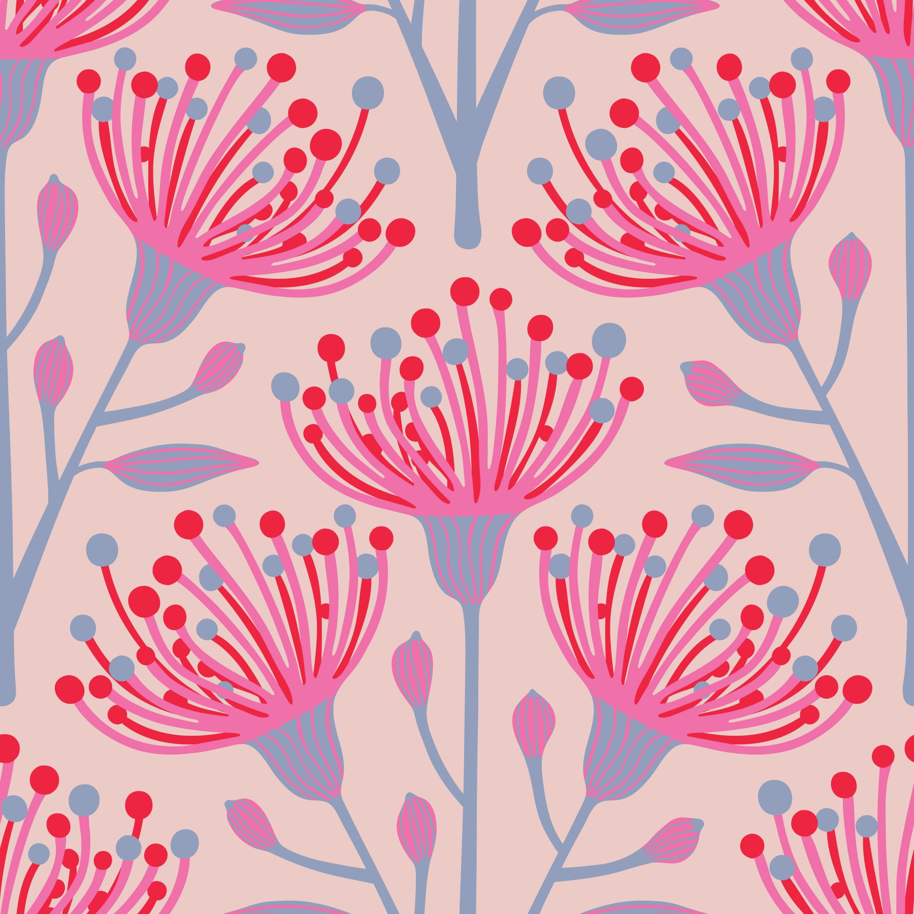 Immerse yourself in the vibrant serenity of our Eucalyptus floral botanical wallpaper. This design showcases a stylized botanical pattern where bold red, lavender purple and fuchsia pink dance against a calming pastel pink background, creating a visually striking feminine aesthetic. The unique floral arrangement evokes the distinctive beauty of eucalyptus blossoms, with their radiating forms and delicate details. This wallpaper offers a fresh and invigorating ambiance, making it ideal for bedrooms, living rooms, or any space that craves a touch of bold color and botanical charm. Elevate your interiors with this statement floral! This pattern design is also available in Other Colourways too! Original wallpaper pattern design by Jackie Tahara of UnBlink Studio.
