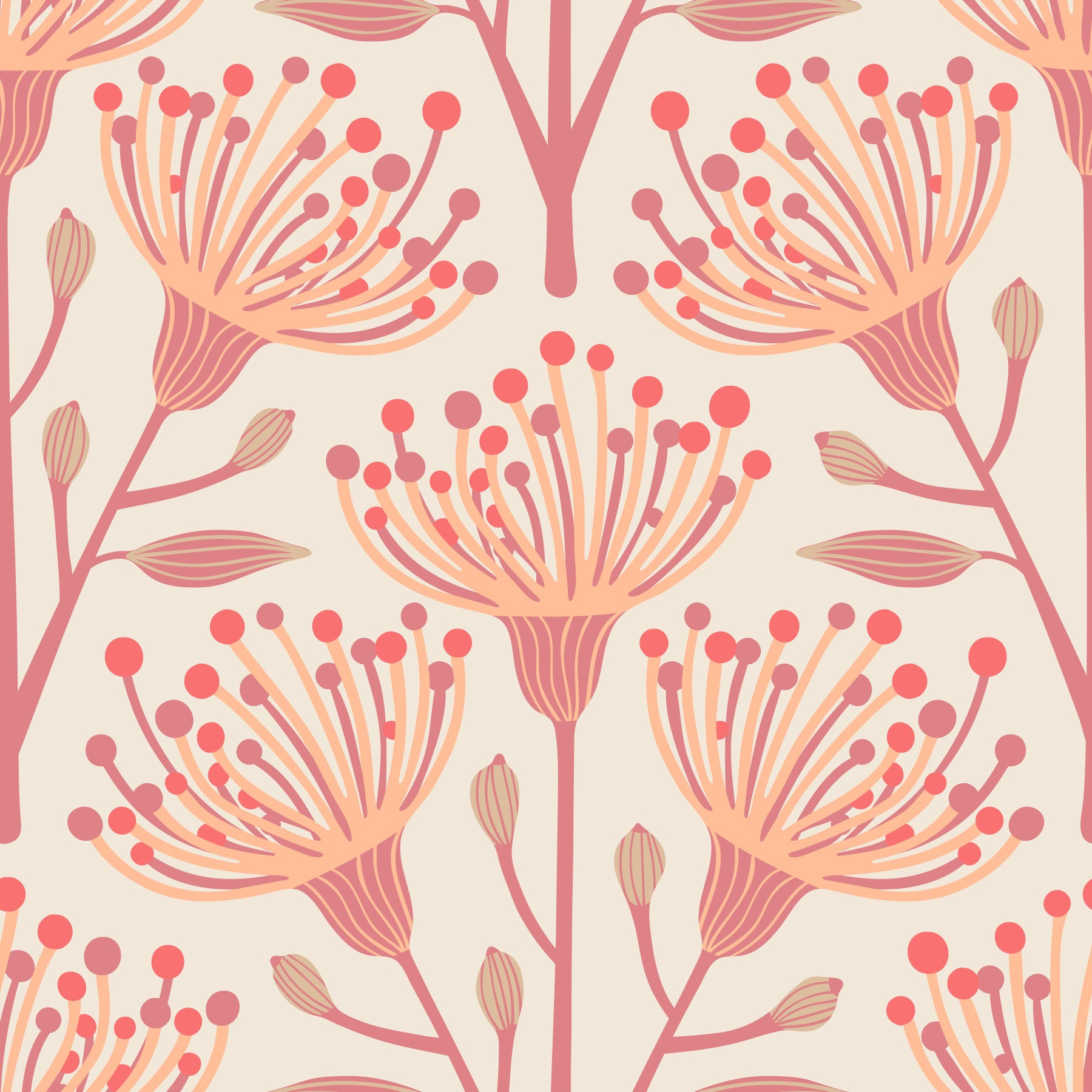 Indulge in the serene charm of 'Eucalyptus' in Peach Fuzz Orange on Cream, a wallpaper that effortlessly blends botanical beauty with a contemporary color palette. This design showcases stylized eucalyptus-inspired florals in shades of peach fuzz orange and gentle rose on cream, creating a calming and inviting atmosphere. The artfully arranged botanical elements add a touch of nature to your space, while the soft, warm colors provide a comforting and sophisticated backdrop. Perfect for bedrooms, living rooms, or any space where you seek a touch of understated elegance, this wallpaper brings a breath of fresh air and a sense of tranquil harmony. Elevate your interior with this sophisticated and soothing botanical design, allowing your walls to bloom with a subtle yet captivating charm. This pattern design is also available in Other Colourways too! Original wallpaper pattern design by Jackie Tahara of UnBlink Studio.