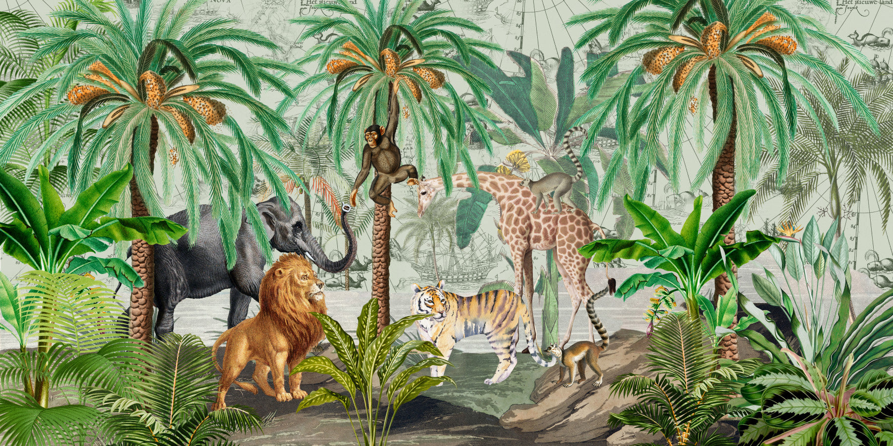 Escape to a lush paradise with this captivating wallpaper. A vibrant tapestry of tropical plants, including majestic palm trees and lush banana leaves, forms the backdrop for a stunning array of wild animals. A majestic lion, an elephant, a playful monkey, and a graceful giraffe stand amid the foliage, exuding a serene yet exotic atmosphere. The antique map subtly peeking through adds a touch of vintage charm and a sense of exploration, making it perfect for adding a unique touch to children's bedrooms, living rooms, or any space craving a touch of natural elegance. The rich greens and earthy tones create a calming and inviting ambience.