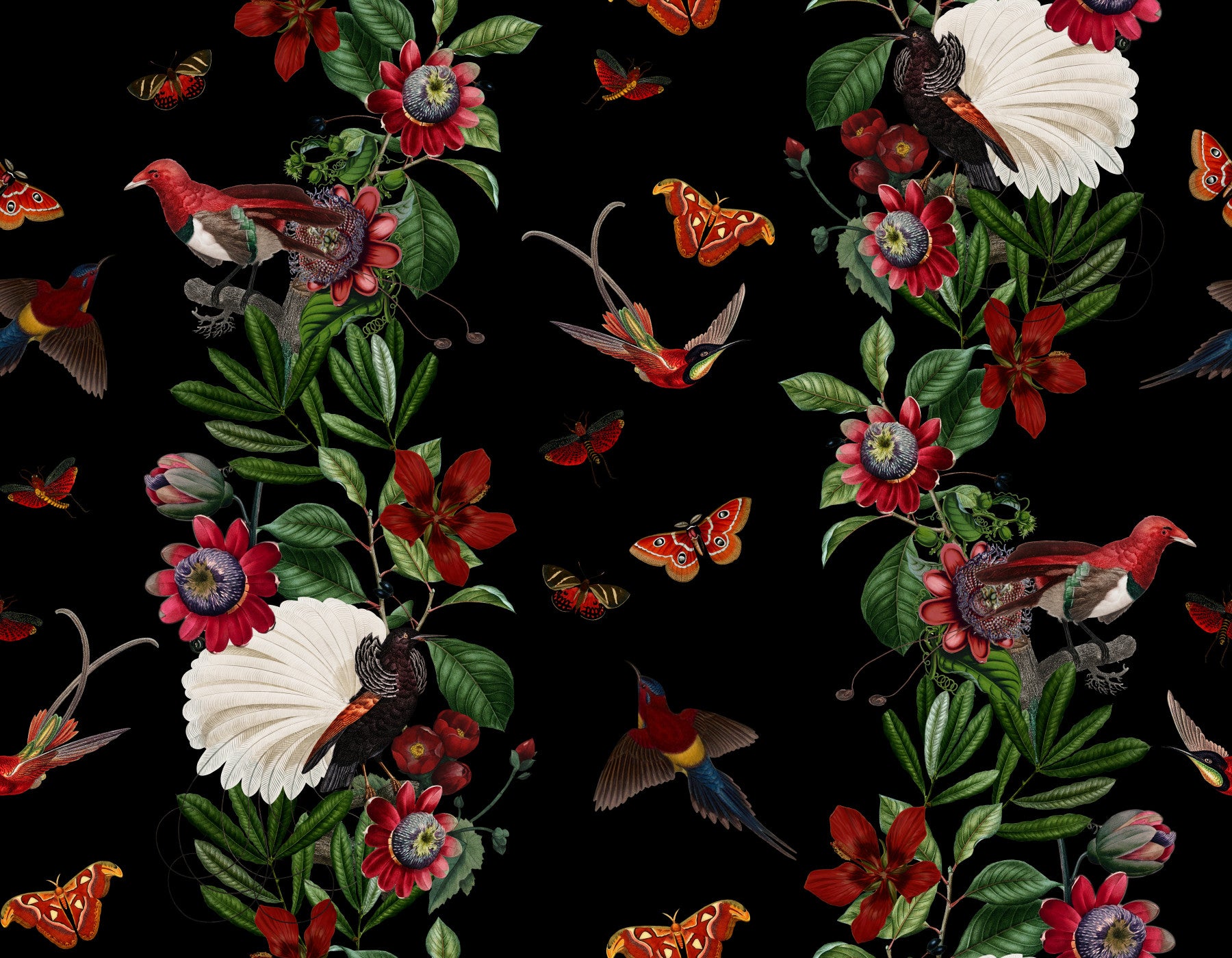 Experience the allure of the tropics with 'Exotic Nights'. This wallpaper design transports you to a moonlit jungle, where crimson passionflowers and deep red hibiscus blooms unfurl under the cover of darkness. Vibrant hummingbirds and birds-of-paradise add a touch of surreal beauty, while delicate butterflies flit among the blossoms. The rich, dark background enhances the dramatic colors, creating an atmosphere of mystery and enchantment. 'Exotic Nights' is a sophisticated choice for those who appreciate bold, luxurious designs, bringing a touch of the wild to any room and creating a dramatic feature wall.