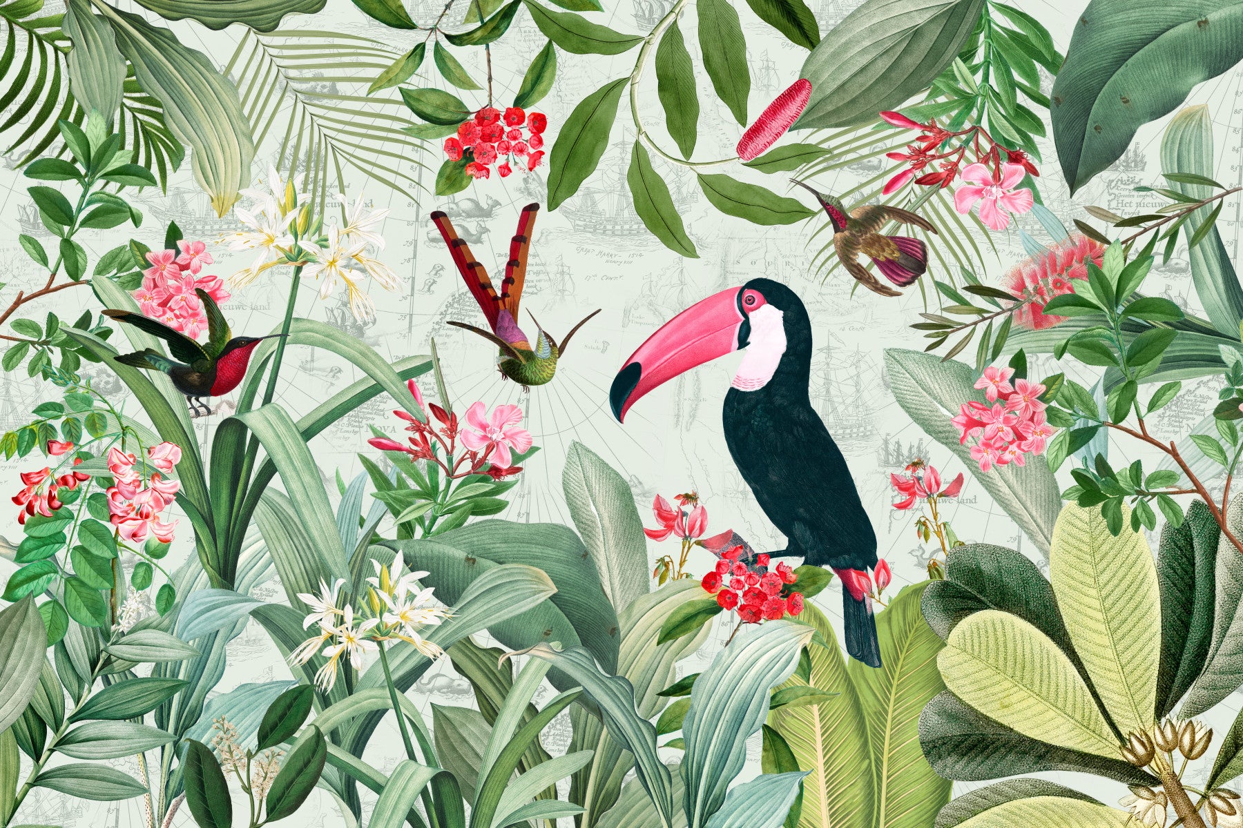 Escape to a vibrant, exotic paradise with this captivating wallpaper. A profusion of lush tropical foliage, including palm leaves and exotic flowers, forms the backdrop for a dazzling array of birds—from delicate hummingbirds to the striking toucan. The antique map subtly woven into the background adds a layer of mystery and adventure. This wallpaper’s rich color palette, featuring greens, pinks, and reds, creates a serene and exotic ambiance, perfect for transforming any room into a lush, tranquil escape.