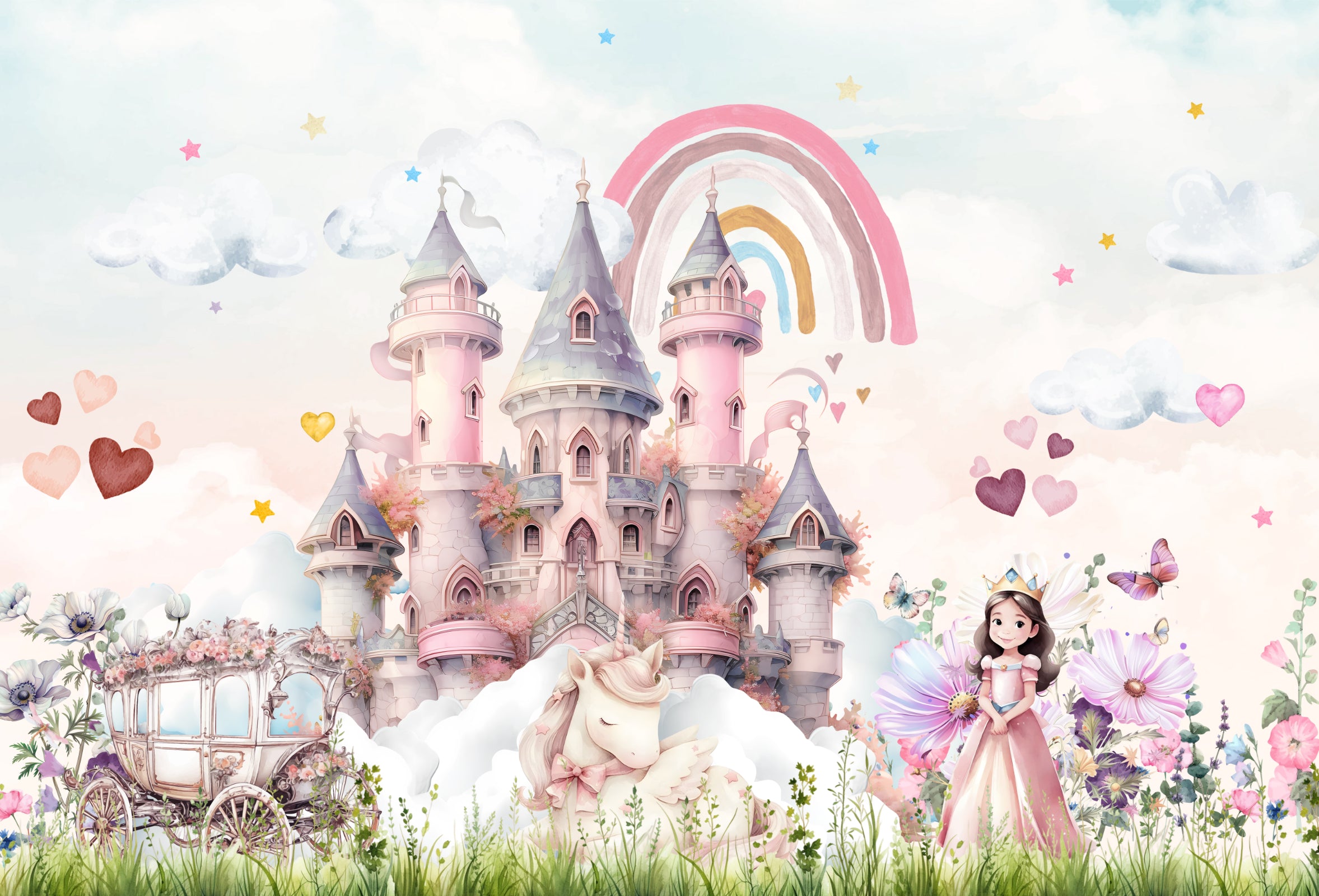 Whimsical castle with a unicorn and rainbow for a magical room setting