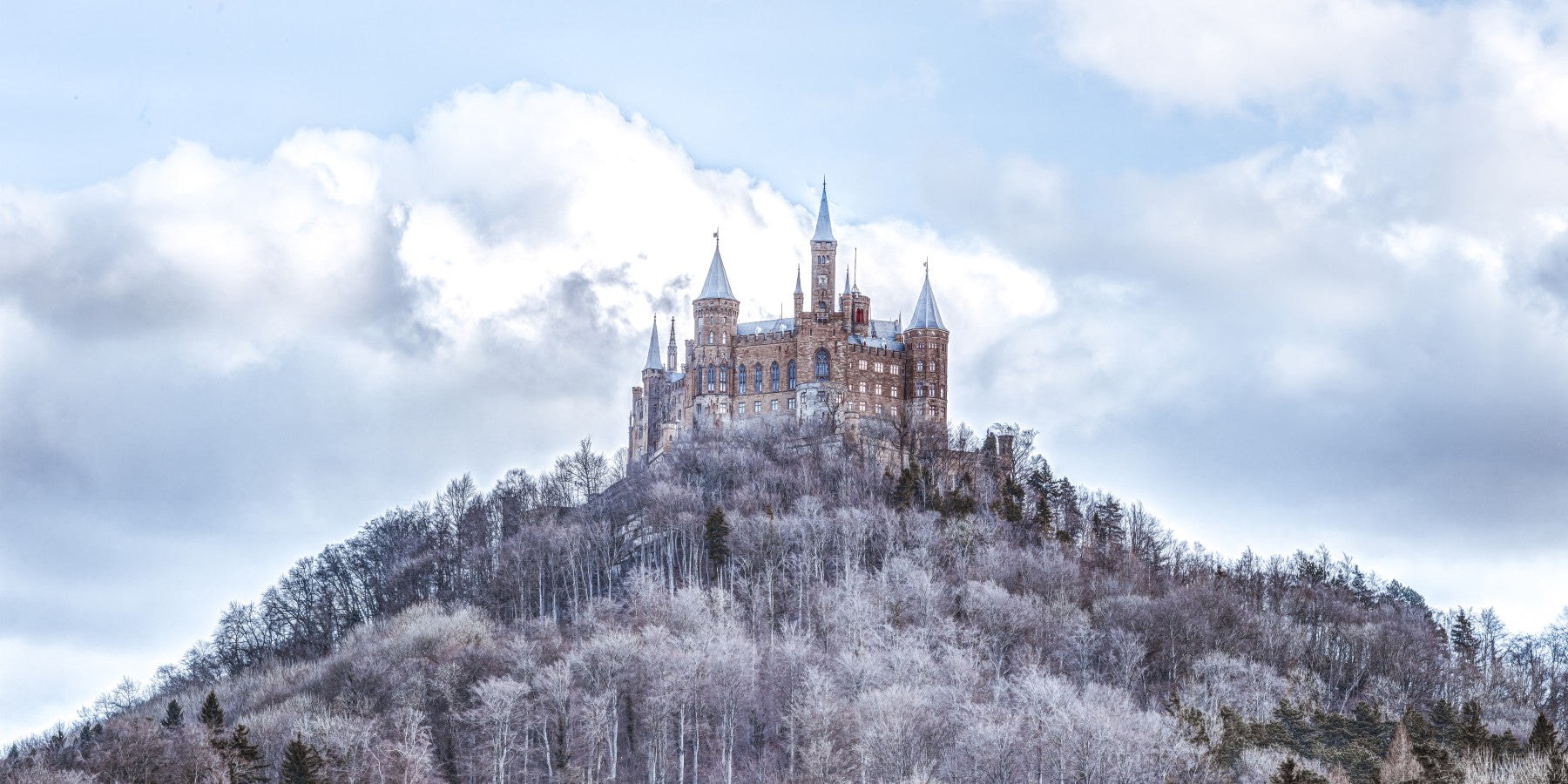 Whimsical castles on towering peaks.