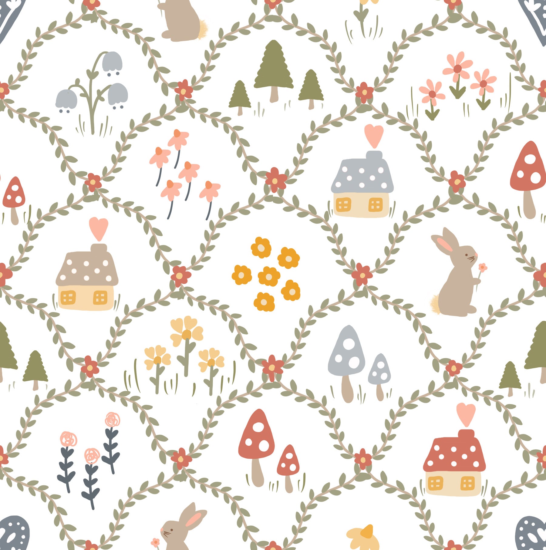 Step into a whimsical Fairytale Meadow wallpaper, where charming cottages nestle amongst flourishing flower wreaths. Playful bunnies hop through the scene, dotted amongst whimsical mushrooms and cheerful wildflowers. Delicate leafy vines intertwine, creating a magical, interconnected landscape. This enchanting design evokes a sense of warmth and wonder, perfect for bringing a touch of fairytale charm to any space. The pastel palette and simple illustrations create a serene and joyful atmosphere, ideal for bedrooms, nurseries, or any room needing a touch of fantasy.