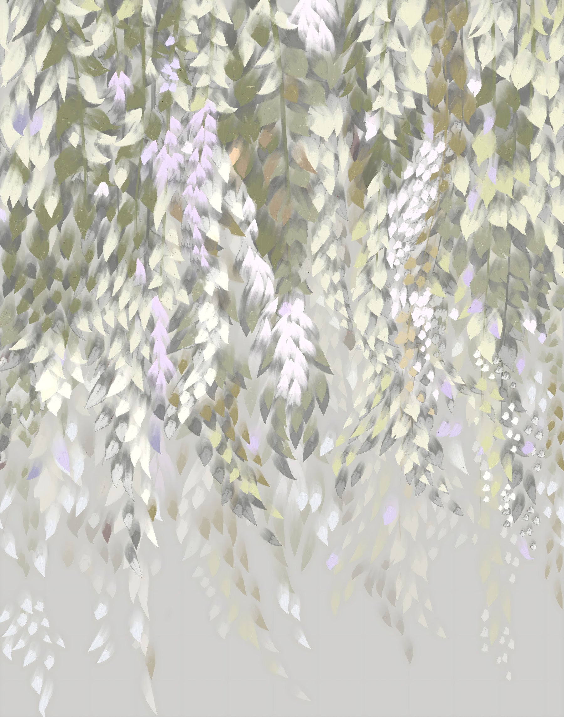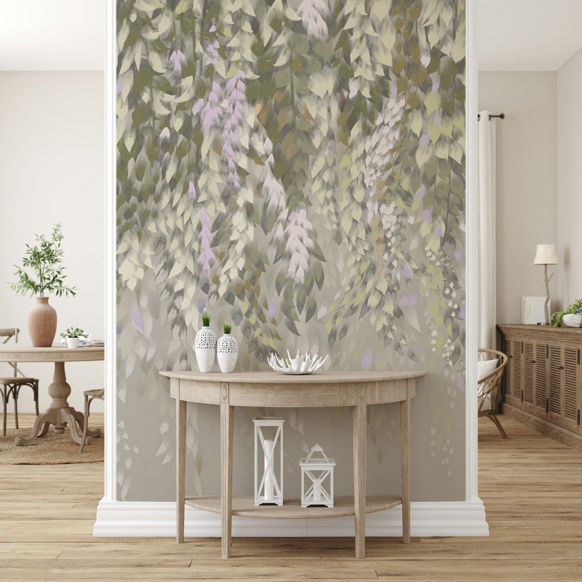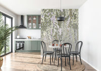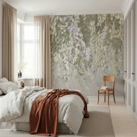Create a tranquil atmosphere with this wisteria-inspired design. Soft greens, creams, and subtle lavender hues cascade down to give any room a sense of gentle calm. The brushstroke details give it an artistic, hand-painted quality. This wallpaper for walls is a perfect fit for bedrooms or living areas where you want to cultivate a peaceful retreat. It also complements minimalist decor by adding a touch of nature without overwhelming the space. It blends well with soft lighting to enhance relaxation.