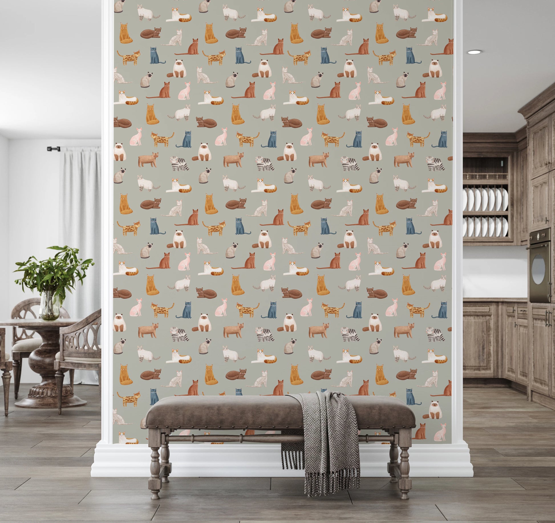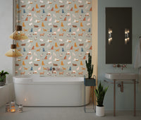 Elevate your space with this charming, hand-drawn wallpaper for walls. The design showcases a delightful array of cats in varying poses, each rendered in soft, warm colours and gentle brushstrokes. This whimsical pattern adds a touch of playful sophistication to any room. The neutral grey background allows the warm hues of the cats—brown, beige, pink, and blue—to shine, creating a comforting atmosphere. Ideal for nurseries, children's rooms, or even a cosy living room, this wallpaper complements both modern and vintage décor. Infuse character into hallways or playrooms with this endearing, animal-inspired design.