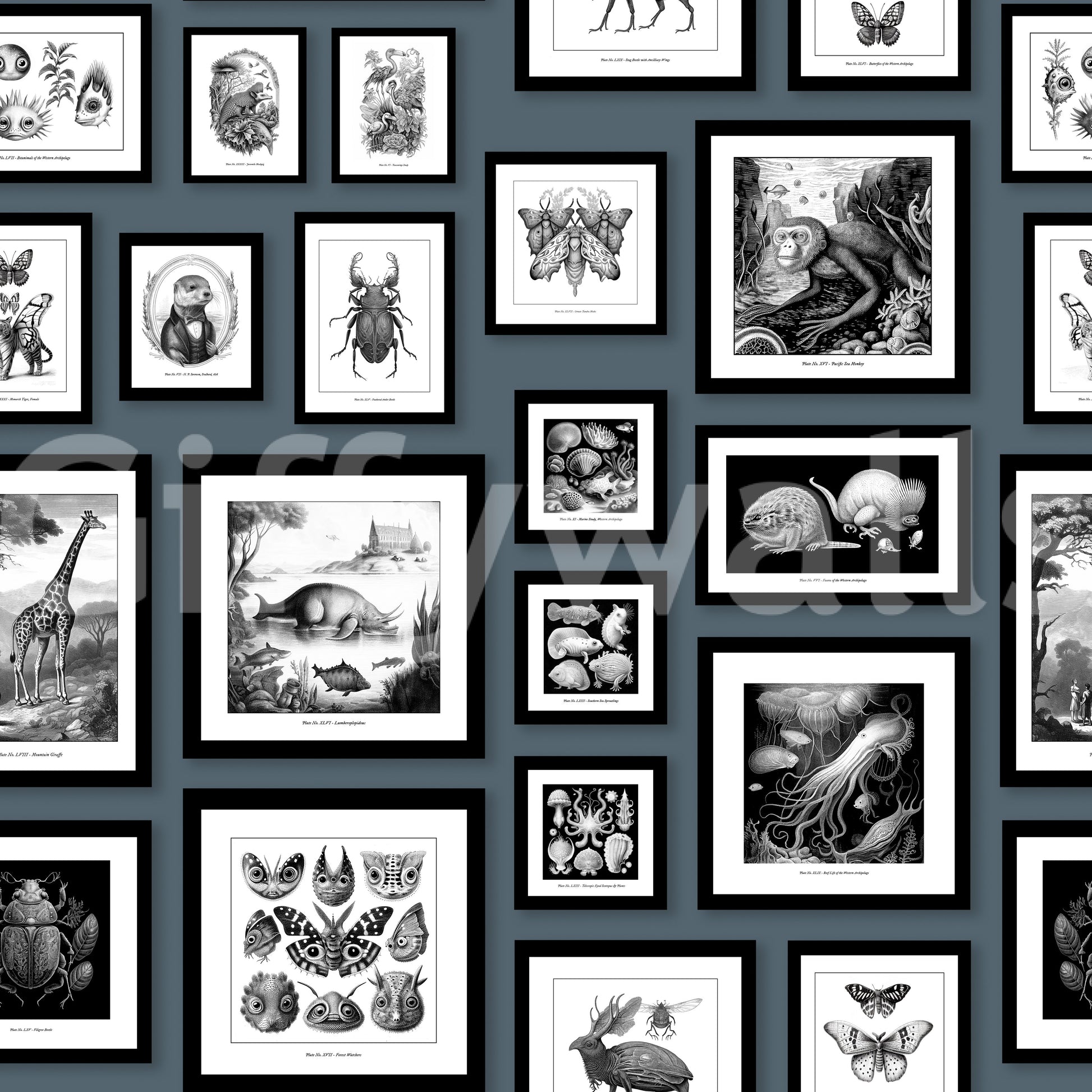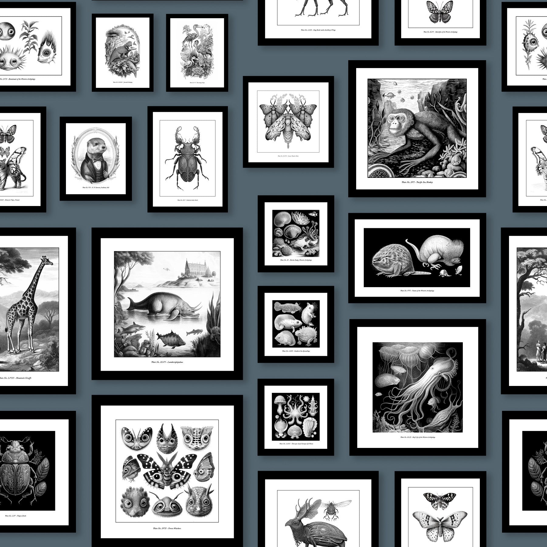 Introducing "Fantastic Creatures" a delightfully surreal wallpaper that puts a cool modern twist on traditional library aesthetics. Designed with an eye for the absurd, it depicts an intriguing world filled with charmingly fantastic creatures, which seem to leap right off your walls, inviting daydreaming and sparking imaginative conversation. A mischievous otter, central to the print, adds a whimsical explorer's touch that sets the mood. Brimming with beautifully strange insects and mysterious creatures heralding from the mythic world of the Western Archipelago, the salon style collection of framed scientific illustrations will lend a surprisingly stately feel to any room. Giving thought to the smallest details, this tastefully dark print seamlessly combines whimsy with sophistication to create a striking balance. As a lively alternative to ordinary wall coverings, the Fantastic Creatures wallpaper in Storm Blue perfectly adds a dash of the unexpected to your interior design.