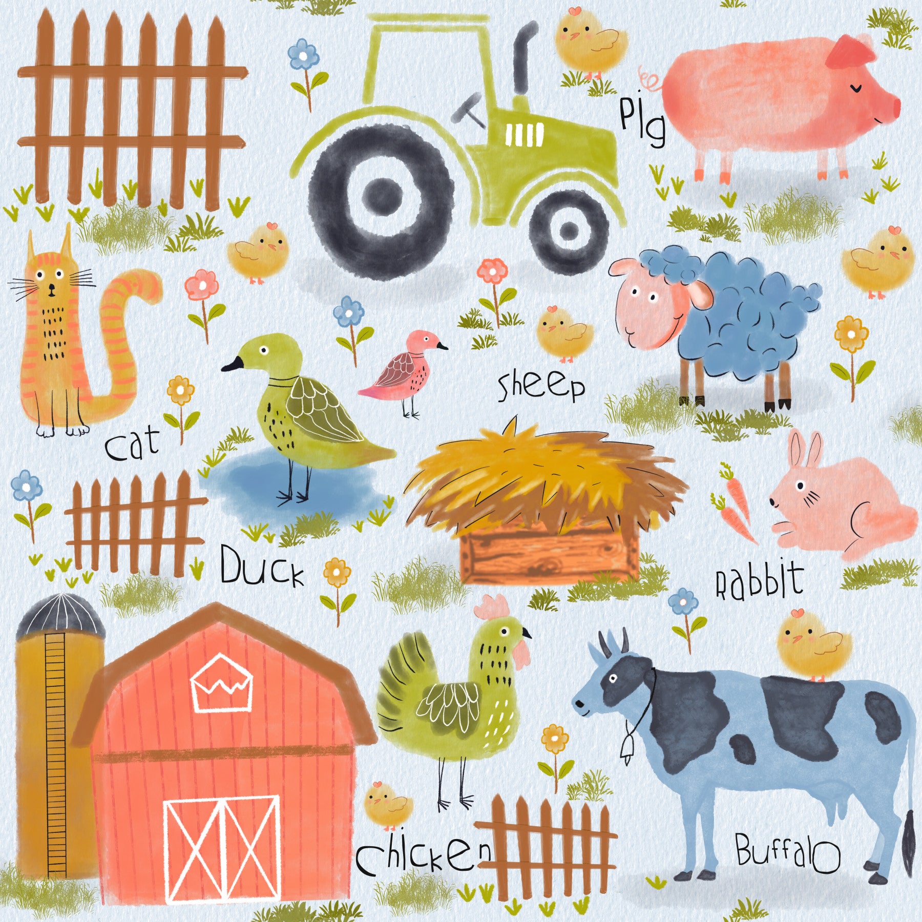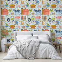 Bring the charm of the countryside inside with this delightful wallpaper for walls. This adorable design features watercolour-style farm animals like pigs, cows, sheep, and chickens, along with a barn, tractor, and cute little chicks. The soft, pastel colours create a cheerful and inviting atmosphere. This playful wallpaper is perfect for a nursery, kids' room, or playroom. It adds a touch of whimsy and complements playful interiors with a happy vibe.