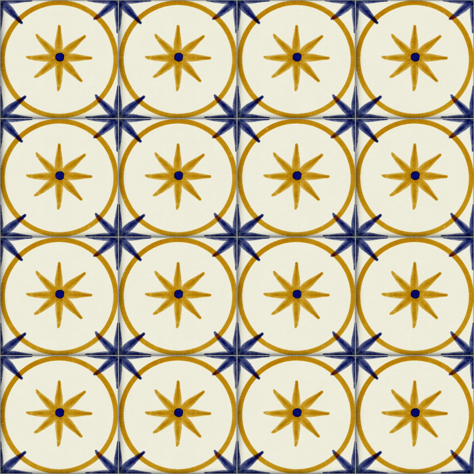 The Farmhouse Timeless Backsplash Gold Wallpaper adds a touch of classic warmth and geometry to your home walls. This design features a delicate repeating pattern of golden starbursts set within clean circles, accented by small blue star motifs that create a sophisticated visual rhythm. The cream background provides a neutral foundation, allowing the golden tones to stand out without overpowering the space. This style mimics traditional tile aesthetics, making it an excellent choice for a timeless, rustic look that suits various interior themes. Durable and easy to apply, this paper provides a lasting, character-filled finish for your walls.