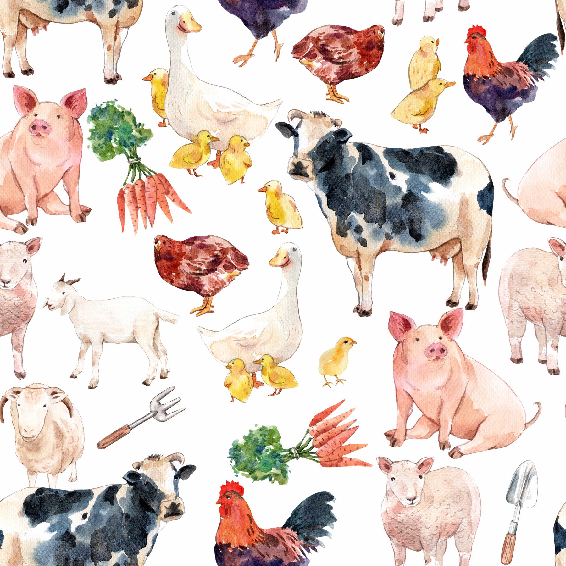 Farmyard Friends wallpaper features a watercolor cow, pig, and chicken print.