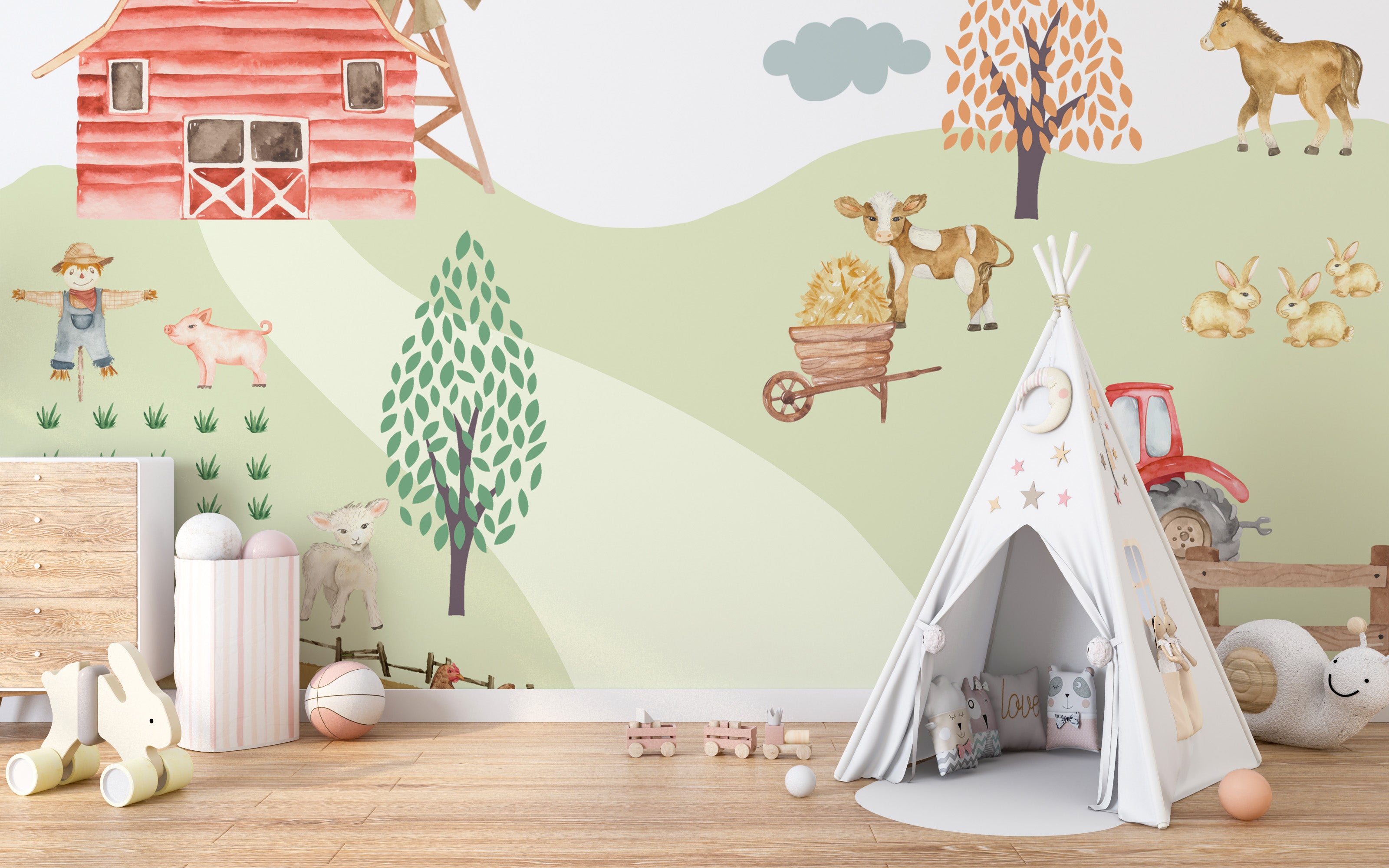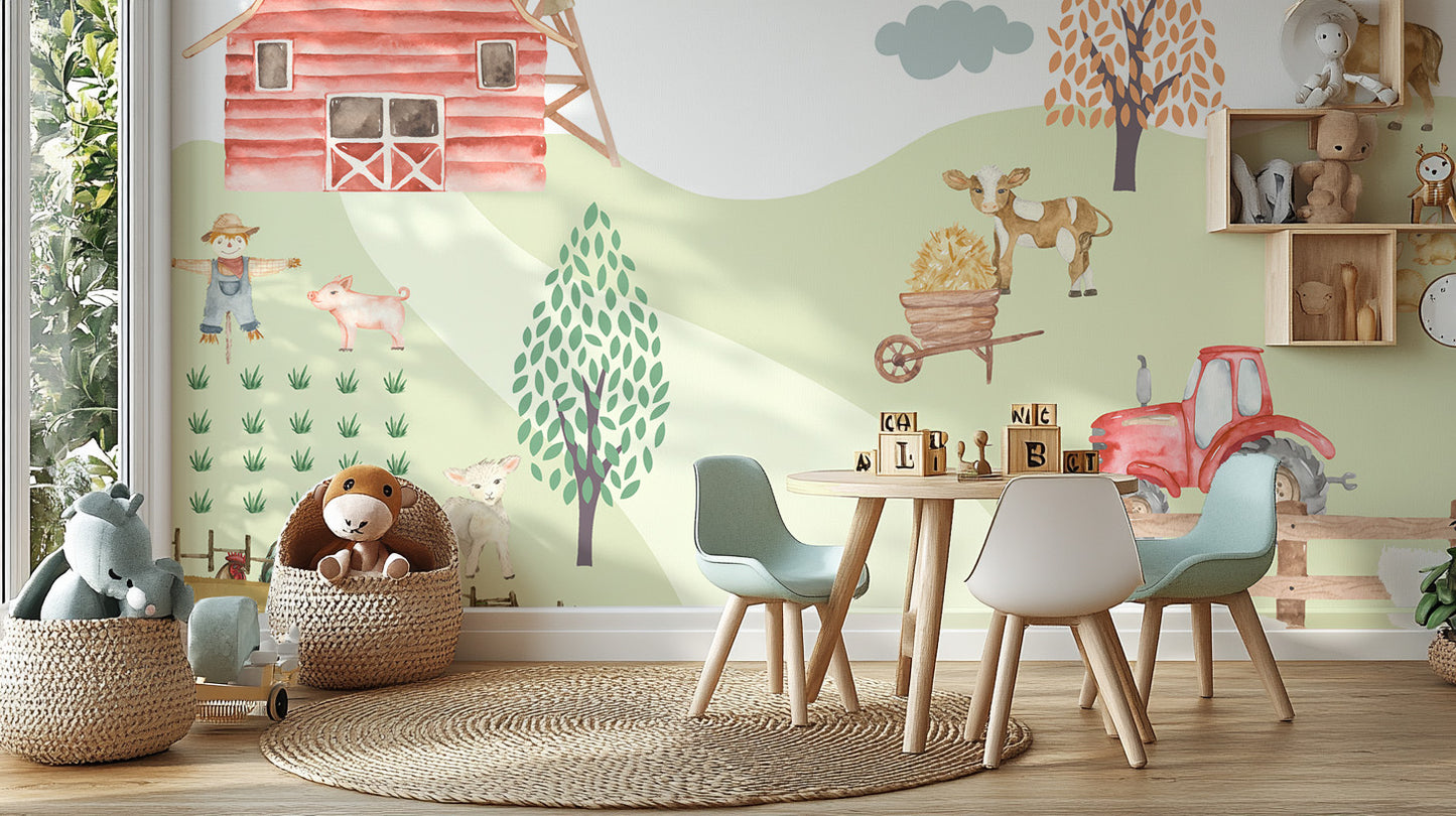 Bring sunshine and farmyard fun to your child's room with this well-designed wallpaper. Featuring playful farm animals, a lovely red barn, lush green fields, and a curious tractor, this design inspires the imagination and brings warmth to any room. This wallpaper works very well in brightening and combining a sense of coziness: in nurseries, playrooms, or children's bedrooms. Made from quality materials, it will last well and is very easy to put up and remove when it's time for a change. Bring farm joy inside, and let them have a creative free run on this wall.