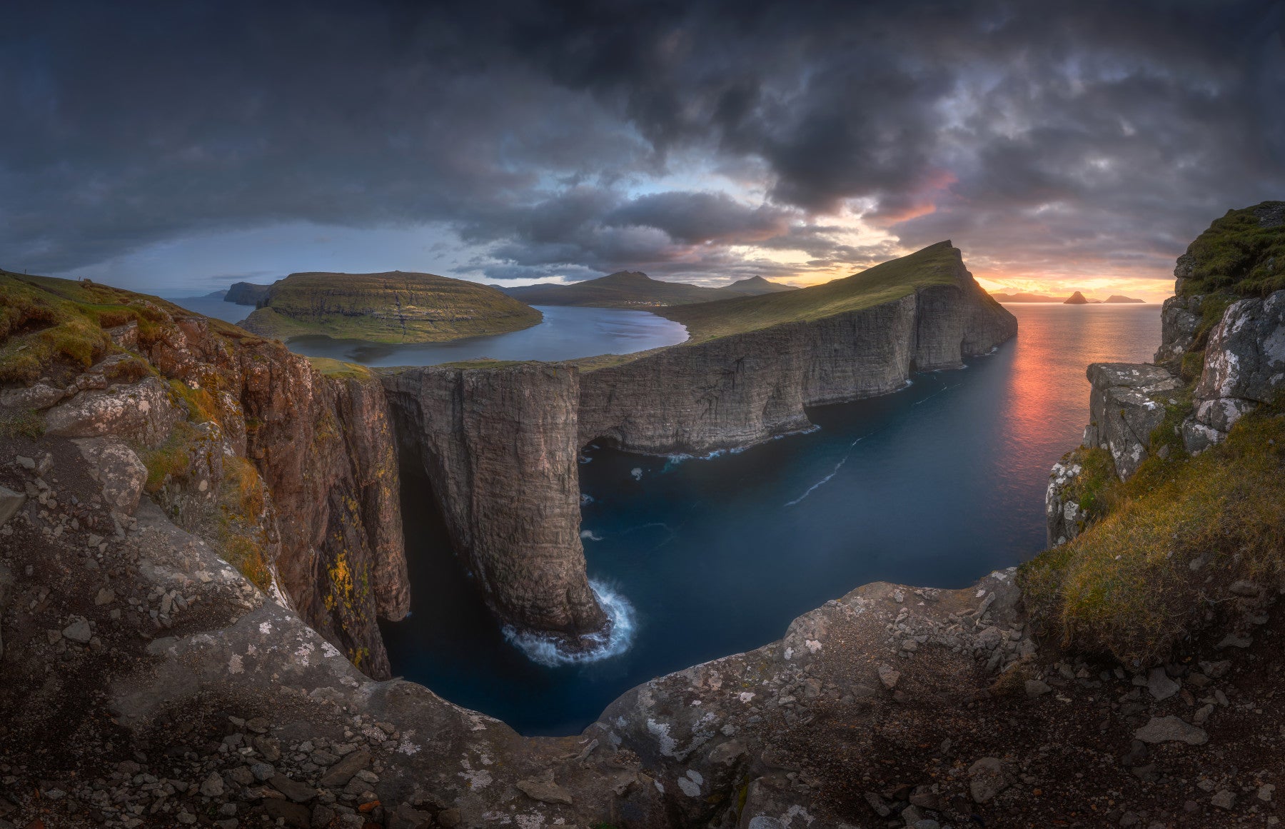 Capture the raw majesty of the Faroe Islands with this striking landscape. Jagged cliffs meet the ocean under a dramatic sky ablaze with dawn's first light. The blue water contrasts with the warm glow on the horizon, bringing nature's power to your walls. This wallpaper transforms any room into a scenic vista. It particularly enhances a living room or study with a nature-inspired design. The stark beauty will complement various interiors, bringing a touch of the wild indoors.