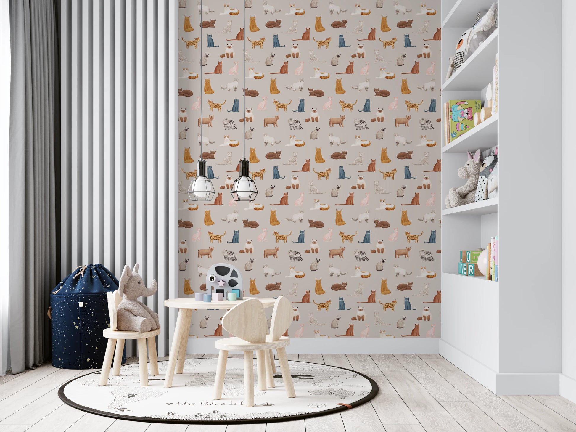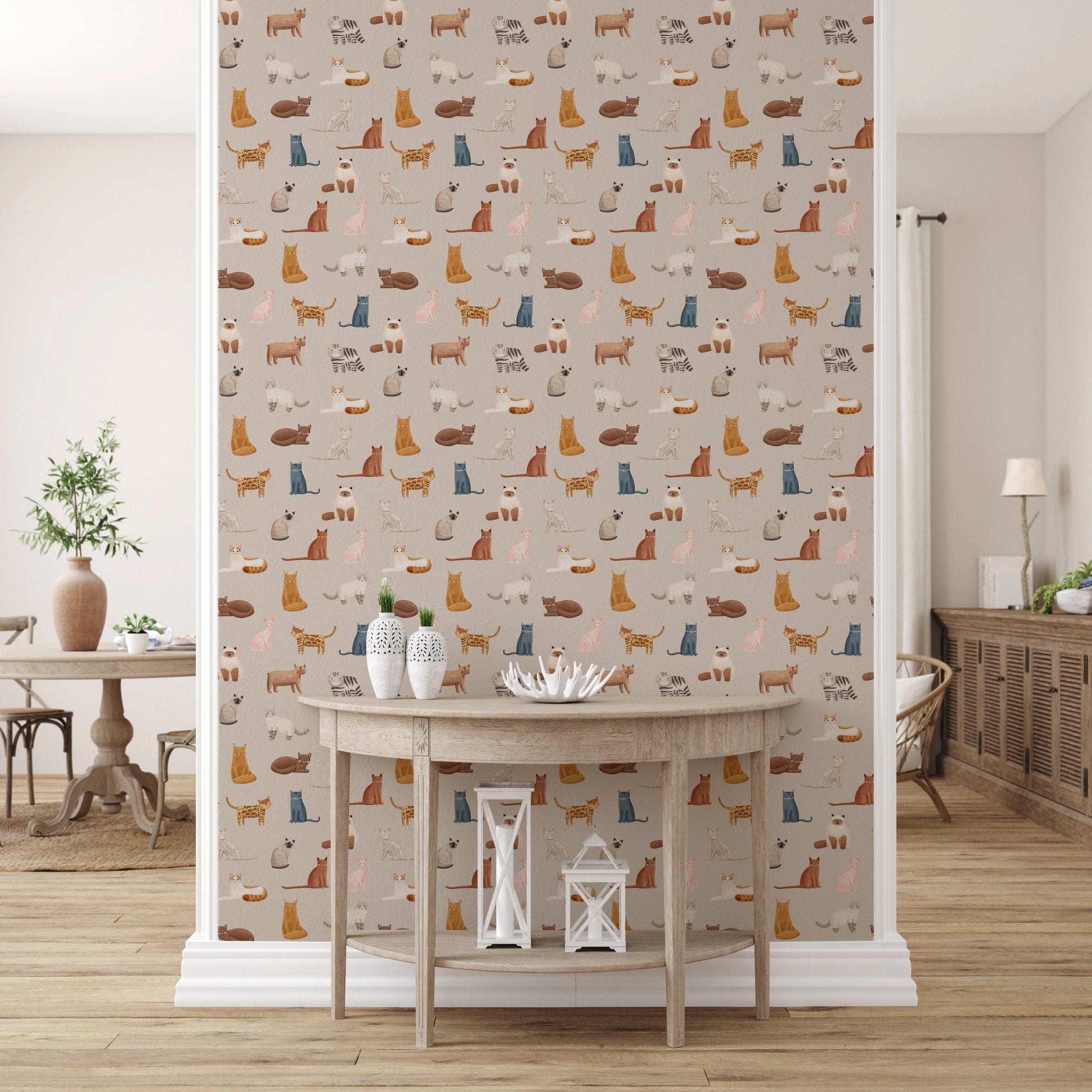 Bring a touch of whimsical charm to your living space with this delightful cat-themed wallpaper for walls. The repeating pattern features a variety of cat breeds rendered in soft watercolour hues of beige, brown, blue, and pink. Each cat has a unique personality and pose, adding character and warmth to any room. This wallpaper works particularly well in nurseries, bedrooms, or playrooms. It creates a cosy and inviting atmosphere that both kids and adults will adore. Introduce feline elegance and playful charm to your home decor.