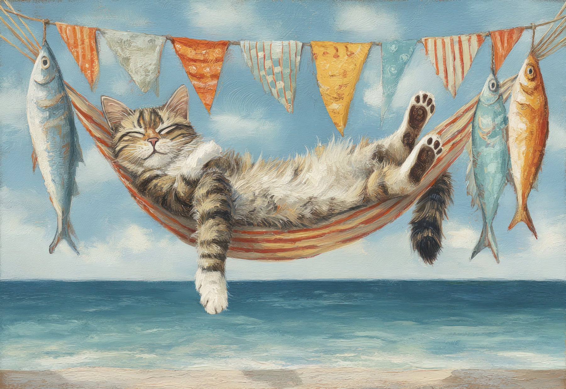 A charming illustration of a contented cat napping peacefully in a hammock, gently swaying above a picturesque ocean scene. The vibrant teal waters and sandy beach create a calming contrast to the colorful bunting strung overhead. The hanging fish add a touch of playful whimsy. This delightful artwork offers a serene and light-hearted aesthetic, ideal for a relaxing and cheerful atmosphere.