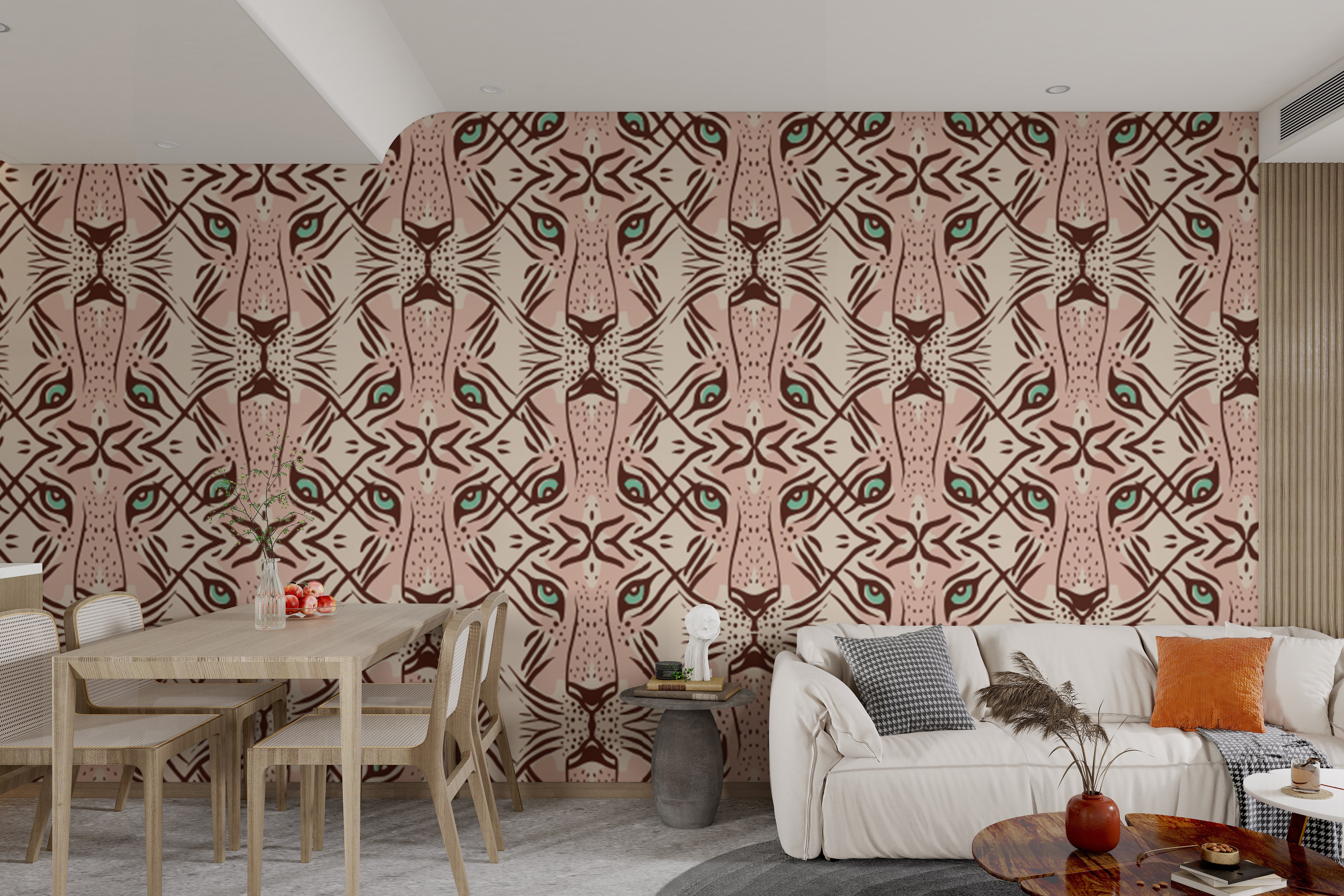 The Feline Gaze Whimsical Wallpaper is a unique decorative choice that combines the serenity of a peach wallpaper base with a playful pattern of cat's eyes and silhouettes. This design marries soft, warm hues with a repeated motif that promises to capture the attention and curiosity of anyone who enters the room. It's a choice that seamlessly blends the love for pets with contemporary design aesthetics. Perfect for a feature wall or a full room, this wallpaper is a conversation starter, adding a touch of feline mystery to your decor without overwhelming the senses.
