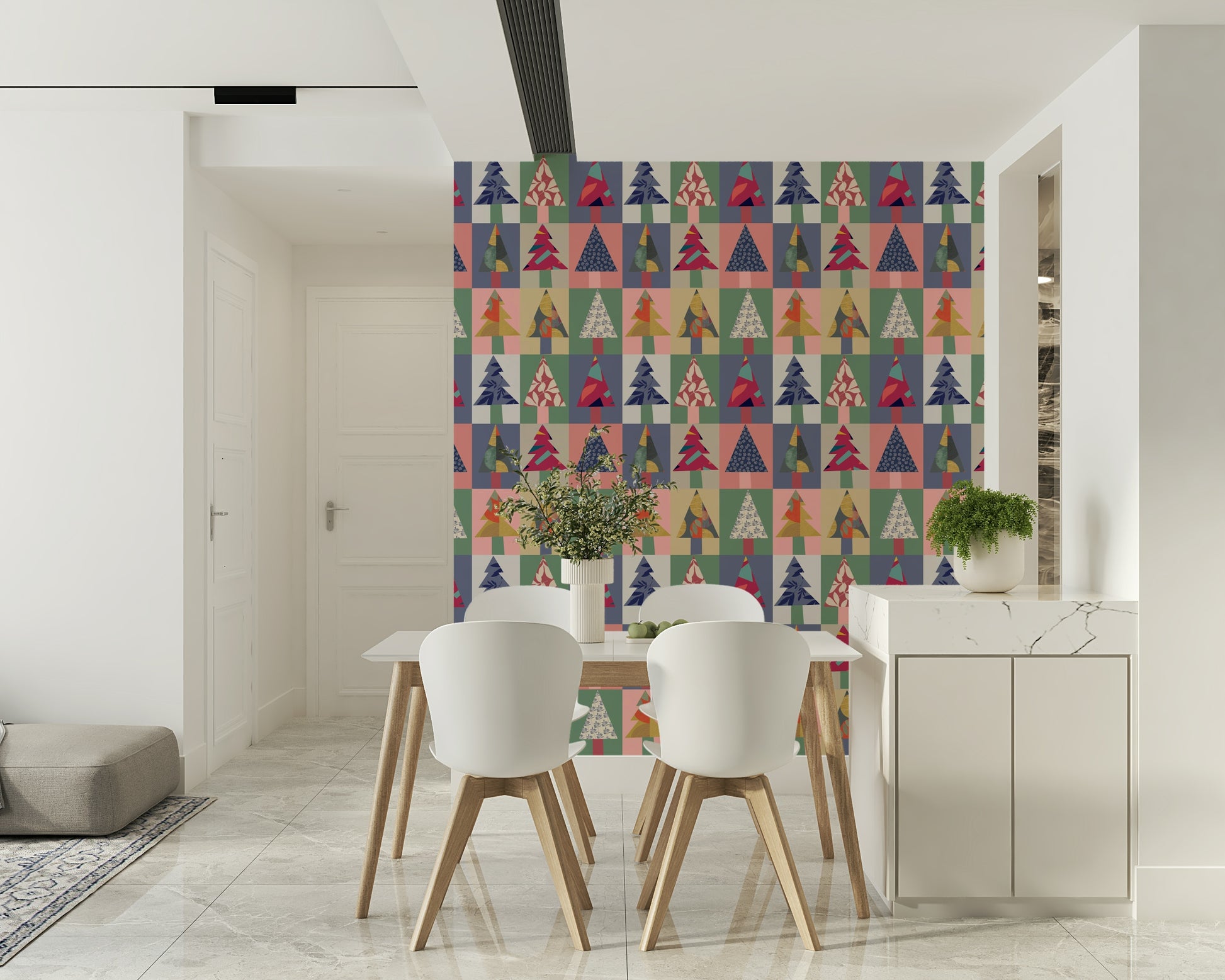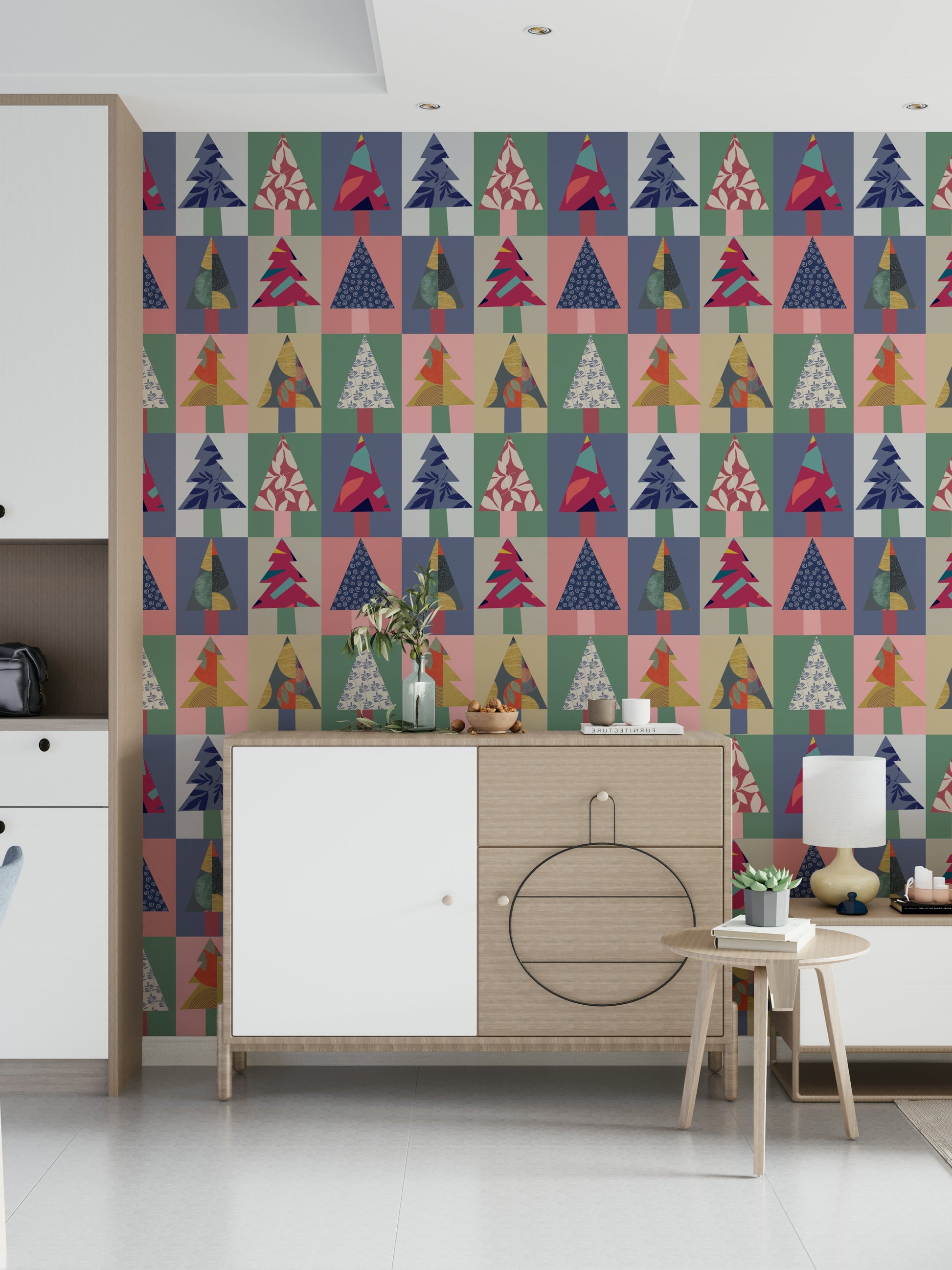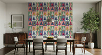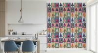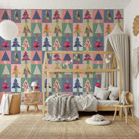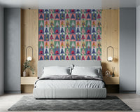 Transform your walls with this vibrant and playful forest-themed wallpaper for walls. Featuring a geometric pattern of stylised trees, each one flaunts unique patterns and textures. The colour palette is a delightful mix of teal, pink, navy, gold, and soft neutrals, creating a modern yet inviting atmosphere. Ideal for living rooms, kids' rooms, or hallways, this design brings a touch of whimsy and sophistication to any space. The bold shapes and varied textures add depth and visual interest, making it a stunning backdrop for your favourite furniture and décor.