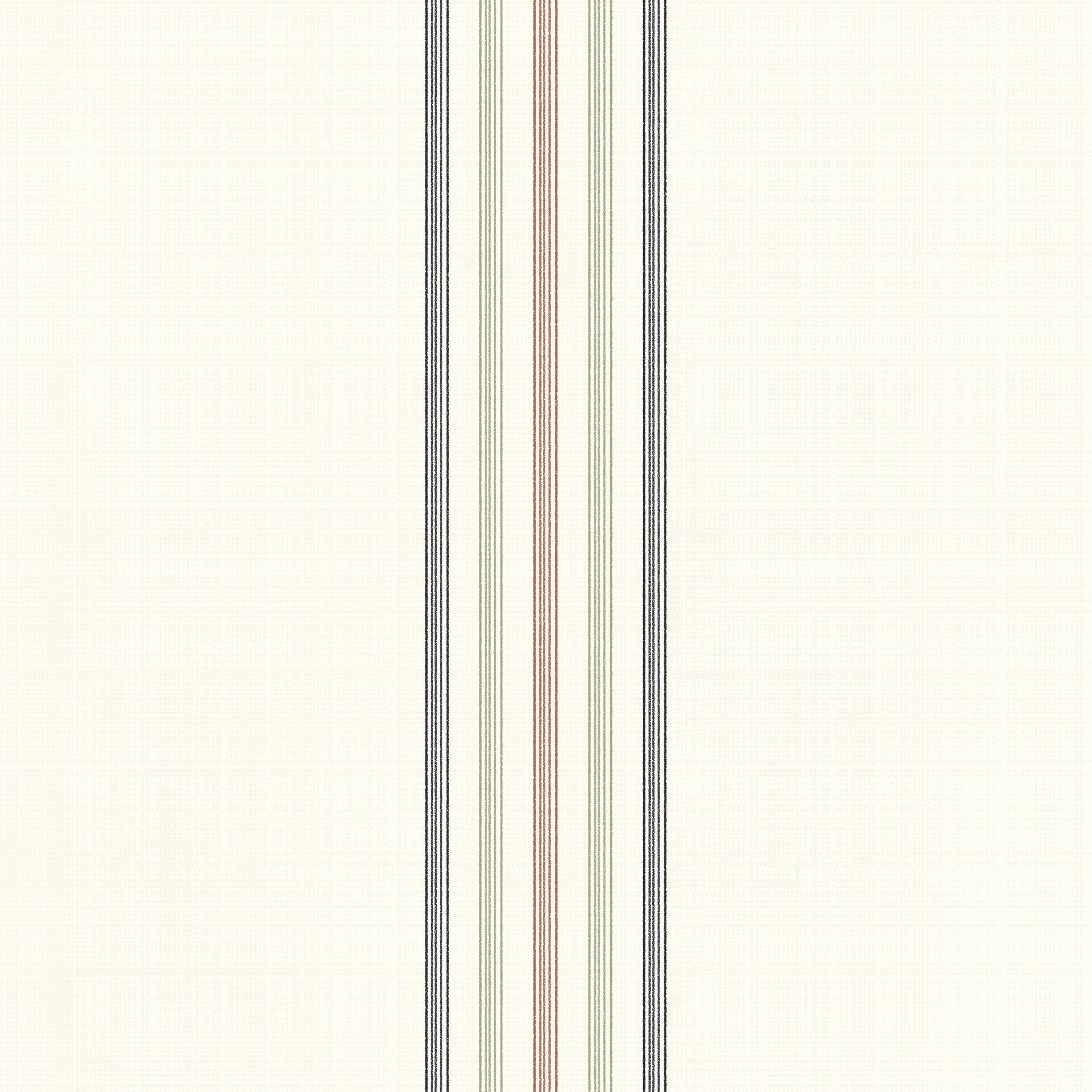 Evoke the rustic charm of country living with Fine Stripes Farmhouse. This wallpaper features a cream-colored canvas texture crossed with soft linear weaves, creating a subtle yet inviting backdrop. Vertical fine stripes in shades of navy, sage green, and barn red add a touch of understated elegance, perfect for creating a cozy and comforting atmosphere. The neutral palette makes it versatile for various spaces, offering a relaxed and timeless feel that embodies the heart of farmhouse style.