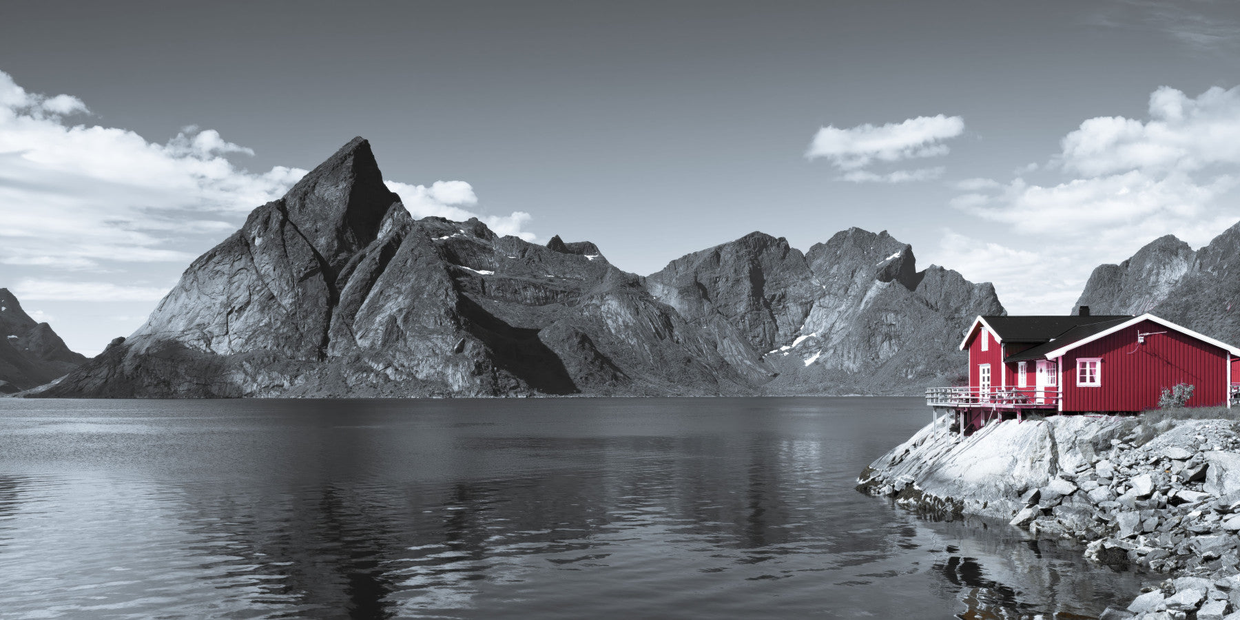 Black-and-white style fjord mural with a contrasting red cabin highlighting the rugged scenery.
