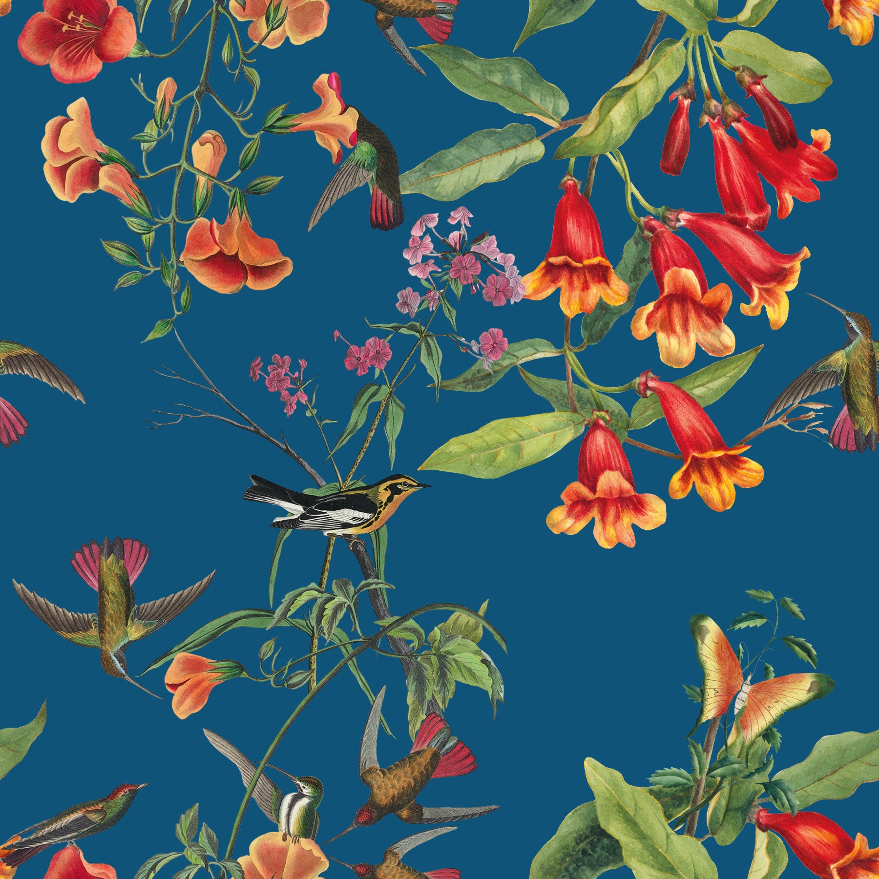 Elevate your space with the beauty of nature using this detailed wallpaper. The design bursts with hummingbird, trumpet flower, and foliage illustrations in vibrant colors on a deep blue background. This wallpaper for walls is an excellent choice for bringing botanical charm to a living room, bedroom, or hallway. The classic style enhances interiors with natural elegance. It adds sophistication and a unique artistic touch.