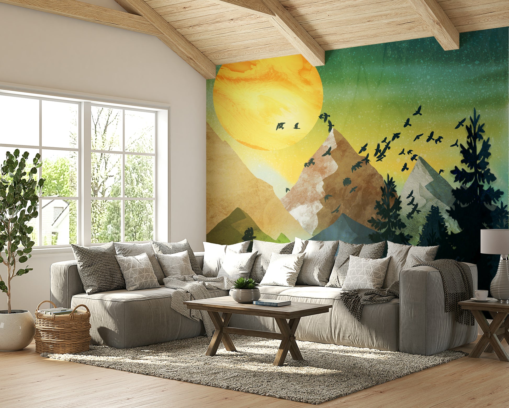 This captivating wallpaper features a dramatic mountain scene with a large, vibrant yellow sun, seemingly close to the earth. A flock of birds in flight soars above the peaks, creating a dynamic composition. The color palette ranges from deep, dark greens of the forested lowlands to warm yellows and oranges of the sky, creating depth and contrast. This artwork is an evocative piece which invites the viewer to appreciate the beauty of nature and the freedom of flight, a captivating visual experience.