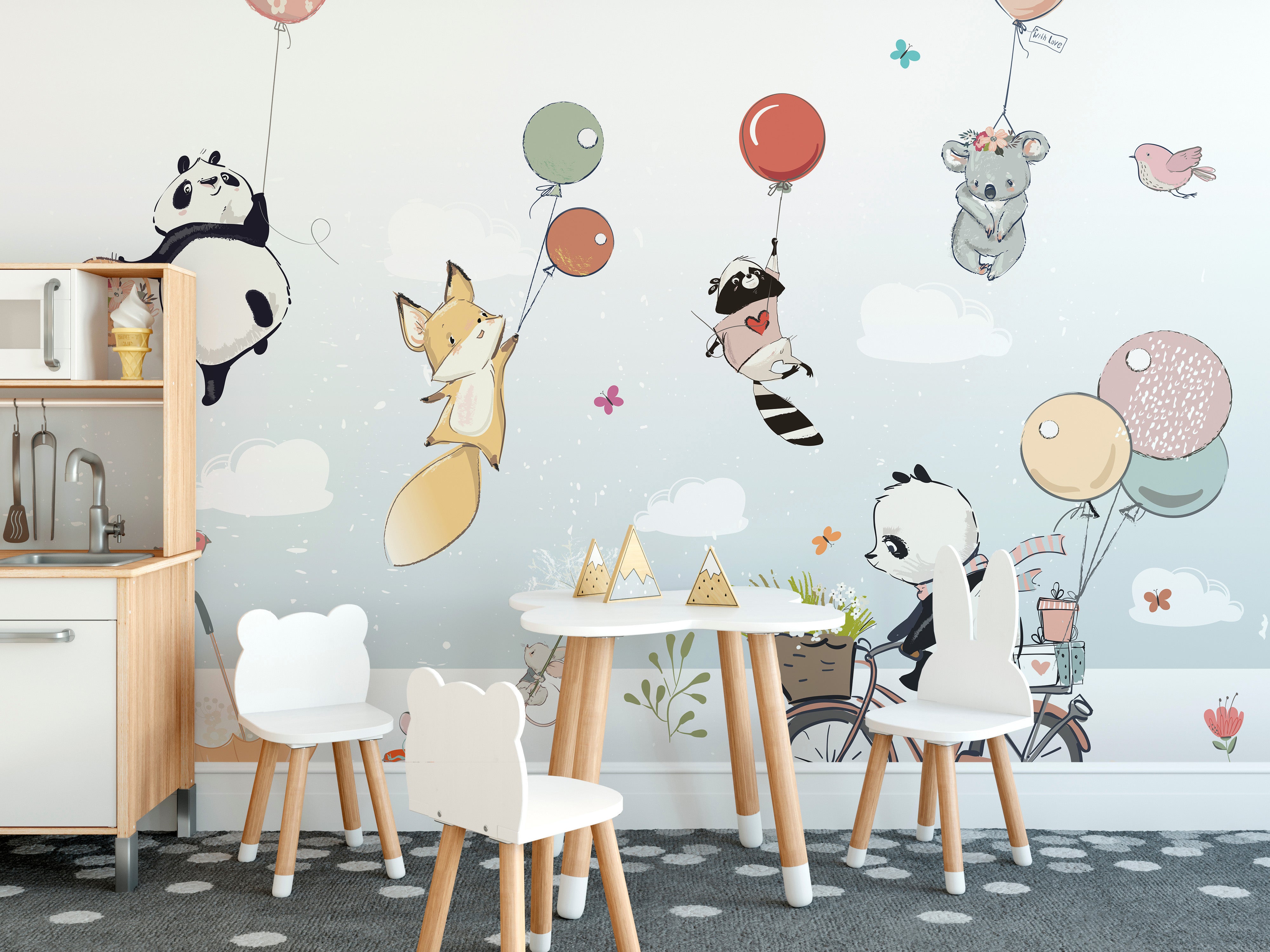 The flying cartoon animals with balloons mural wallpaper is a delightful and whimsical addition to any child's room. In this enchanting scene, a joyous assembly of sketched animals takes to the sky, each held aloft by colourful balloons. This aerial parade includes a panda with a basket of flowers, a fox with a playful expression, a raccoon sporting a heart, and a koala adorned with a floral headpiece. Below, another panda rides a bicycle, its basket brimming with blossoms. This cartoon wallpaper, bursting with pastel hues and playful imagery, will spark imagination and bring a sense of playfulness to a kids room, serving as a backdrop for adventures dreamed up during playtime or a cozy story at bedtime.