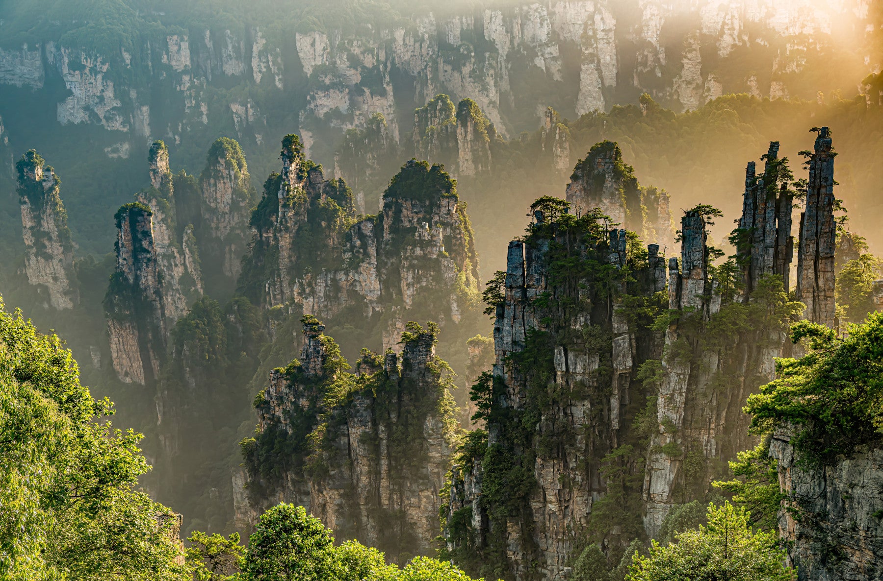 Escape into the ethereal beauty of "Floating Woodland Peaks," a mesmerizing wallpaper that captures the otherworldly essence of towering stone formations adorned with lush greenery. Bathed in a soft, golden light that filters through the mist, these monolithic peaks appear to float effortlessly amidst the verdant landscape. This stunning vista evokes a sense of serenity and wonder, transforming your screen into a window to a hidden, enchanted realm. The intricate details of the rocky surfaces, combined with the vibrant foliage clinging to their sides, create a captivating contrast that is both visually striking and deeply calming. Perfect for those seeking a touch of adventure and tranquility, "Floating Woodland Peaks" will transport you to a world where nature reigns supreme.