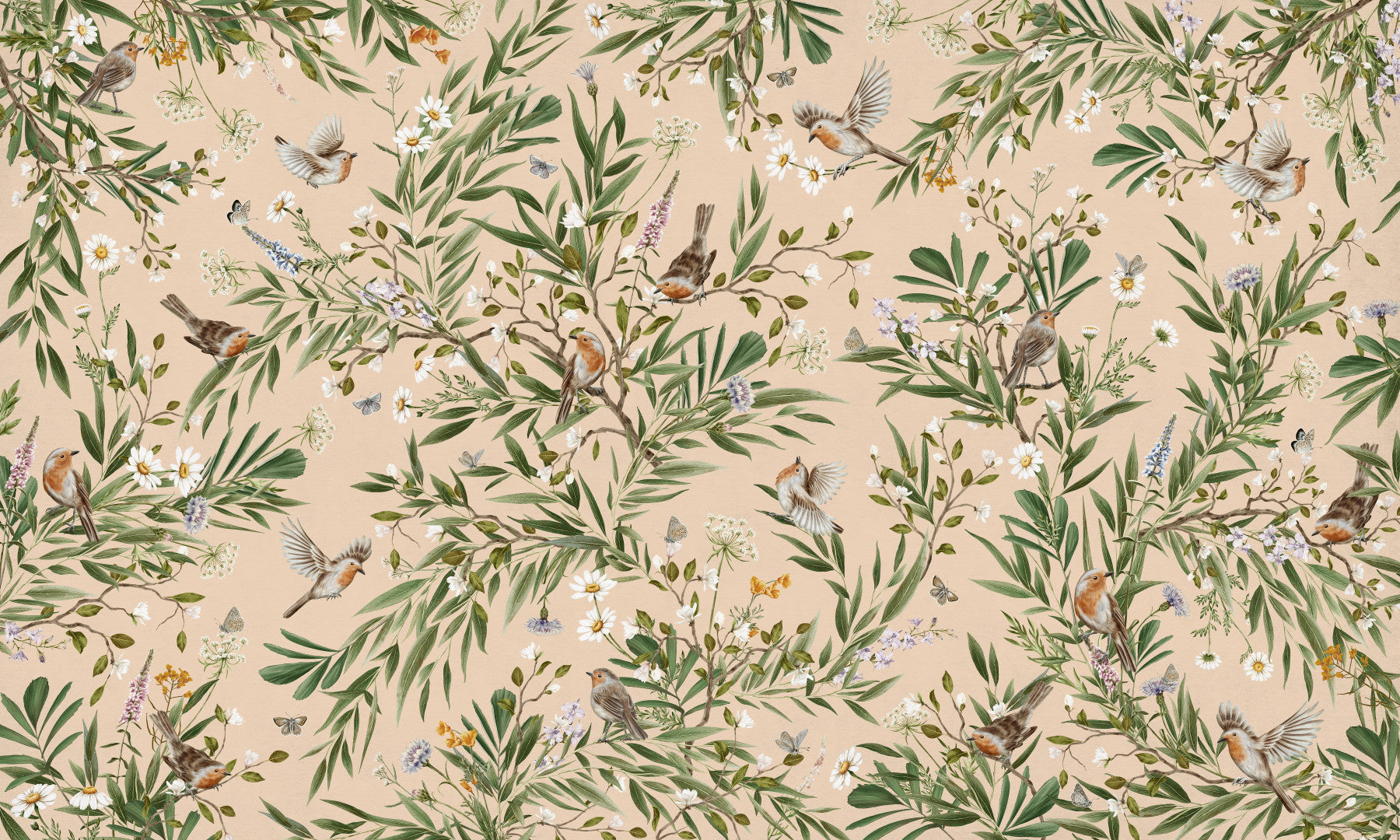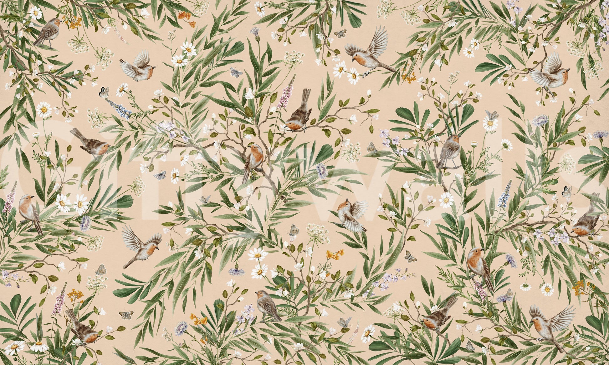 Transform your space with this delicate botanical design. Sweet robins interact with soft, trailing foliage on a warm background. This wallpaper for walls lends a touch of nature's elegance to your home. It enhances bedrooms and living rooms with its relaxing ambiance. The charming illustration style adds a unique flair. Its soft colours and intricate details make it an excellent choice to create a tranquil and uplifting atmosphere. Imagine enjoying a calm oasis in your own home.