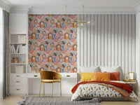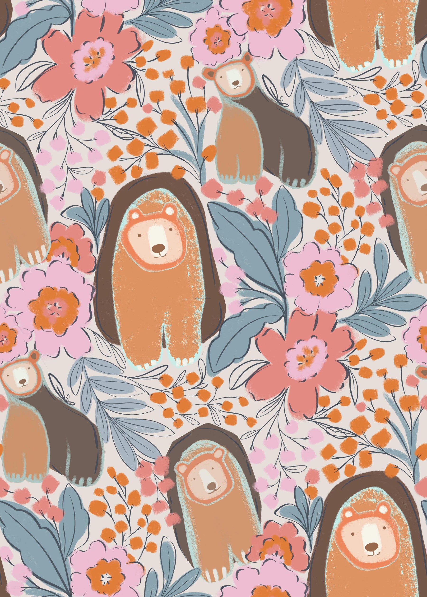Transform your space with 'Floral Bears' Den,' an endearing wallpaper for walls that blends nature and animal motifs. This design showcases bears amongst abstracted flowers and foliage in a soft, inviting palette of pinks, oranges, blues and browns. This wallpaper infuses warmth into any space. The design's gentle aesthetic makes it ideal for kids' rooms, bedrooms or playrooms. It pairs well with light wood furniture and pastel decor, bringing a touch of the outdoors inside.