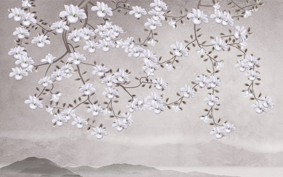 Enhance your walls with our floral branches mountain wall mural, a perfect blend of natural splendor and modern aesthetics. This gray-colored wallpaper mural captures the delicate beauty of flowering branches against a serene mountain range, offering a peaceful visual escape. Ideal for anyone looking to infuse their home with a botanical touch and subtle elegance, this floral mural is versatile enough to complement any interior with its timeless grace.