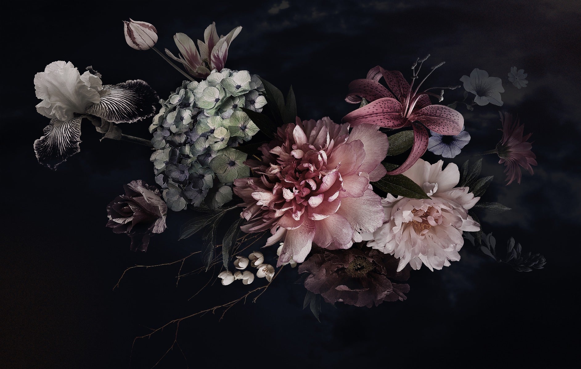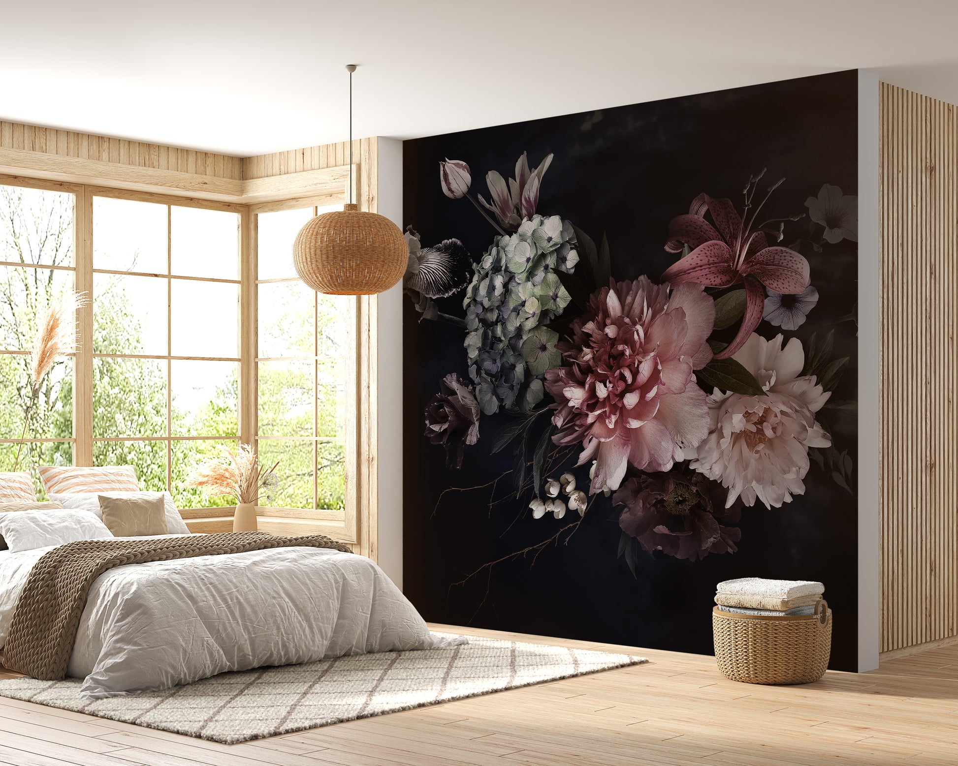 The floral display mural wallpaper is a captivating addition to any room. The dark backdrop sets the stage for the vibrant, intricate flower designs that seem to leap off the wall. The detail in each petal and leaf is stunning, making it easy to get lost in the mural's stunning beauty. You'll feel like you're in the middle of a lush, enchanted garden no matter where you decide to put it up. It's the perfect way to add some depth and personality to your decor with ease. So why settle for plain walls when you can have stunning flower wallpaper that elevates your space in every way!