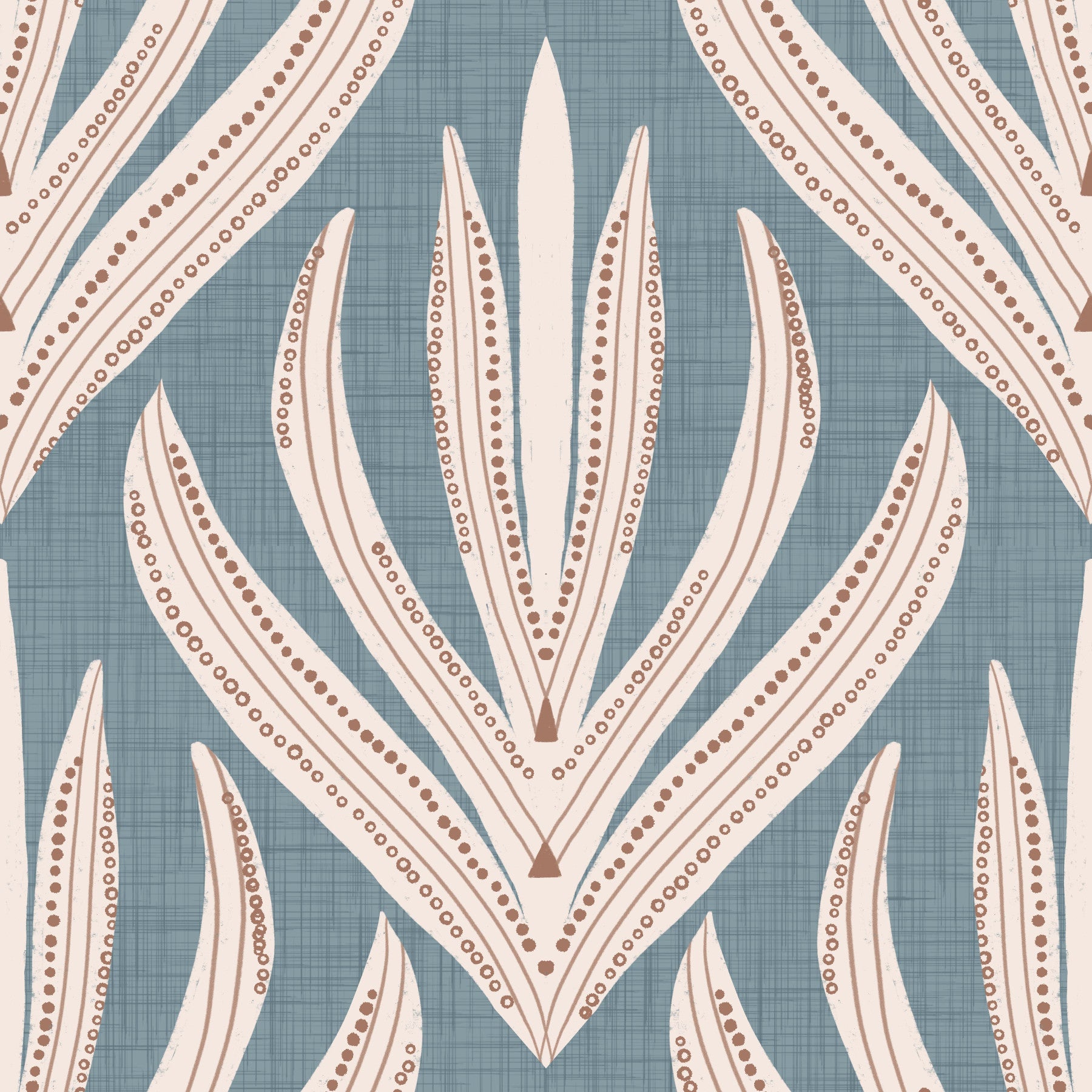 This stunning geometric floral design brings a touch of modern sophistication to any room. Beige organic shapes with dotted outlines layer over a muted blue, lightly textured backdrop. The result provides an inviting pattern, both calm and captivating. Ideal for bedrooms, living areas, or hallways, this wallpaper for walls offers a refreshing alternative to common floral patterns. It complements minimalist interiors and provides a focal point in spacious, modern rooms.