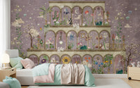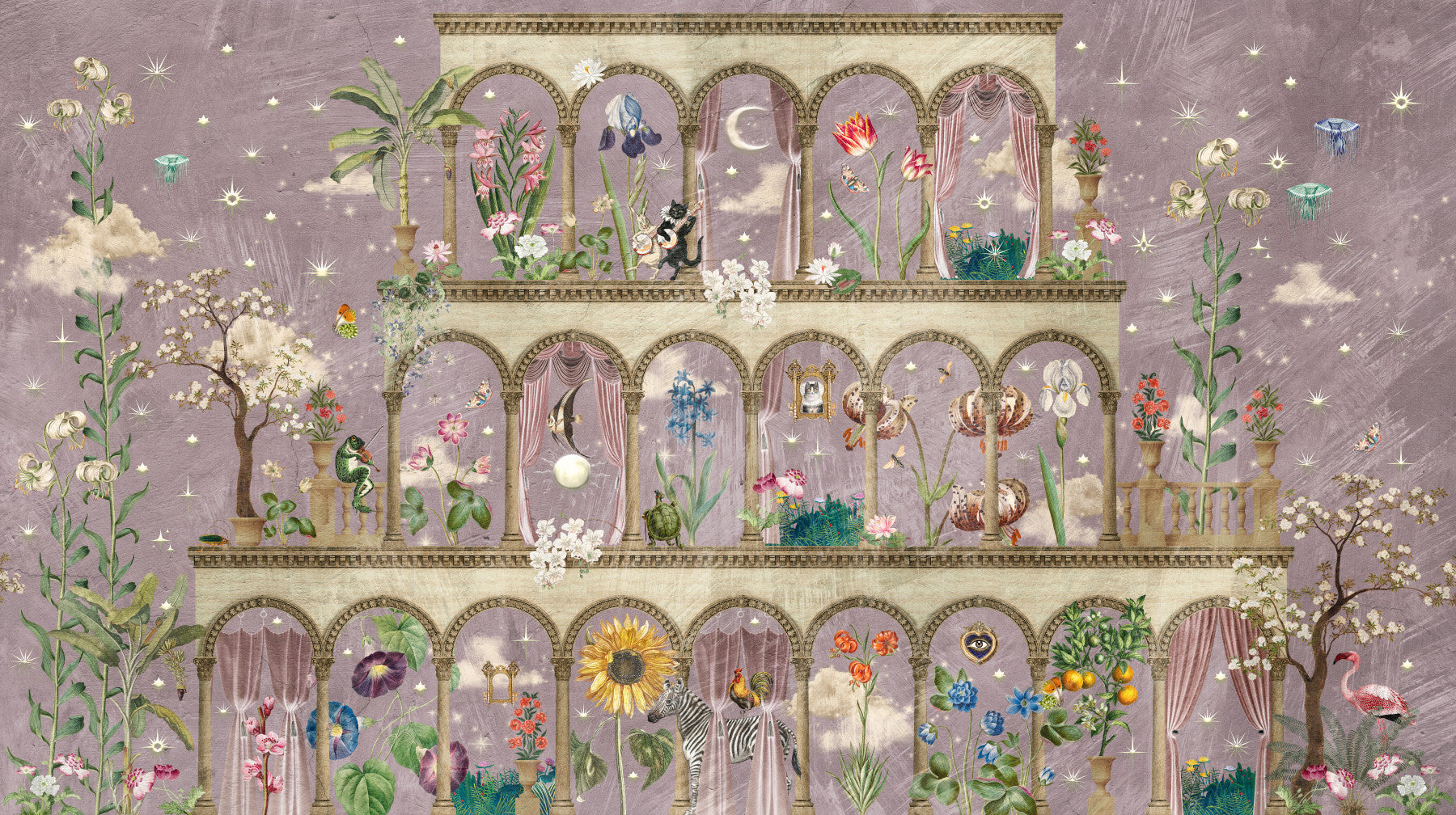 Transform your space into a whimsical dreamscape with "Floral Nightscape Garden on Pink". This enchanting design conjures the magic of a moonlit garden, showcased within a tiered architectural structure. Delicate blooms of every hue blossom against a soft pink canvas dusted with twinkling stars. Elegant archways frame surreal scenes: a feline musician serenading the moon, a whimsical zebra juxtaposed with a golden sunflower, and fantastical creatures amidst the foliage. Pale pink draped curtains add a touch of romance and grandeur to the scene. This wall décor brings a touch of the surreal to your walls and creates an environment that is both relaxing and inspiring. Invite the tranquil beauty of a nocturnal floral fantasy into your home.