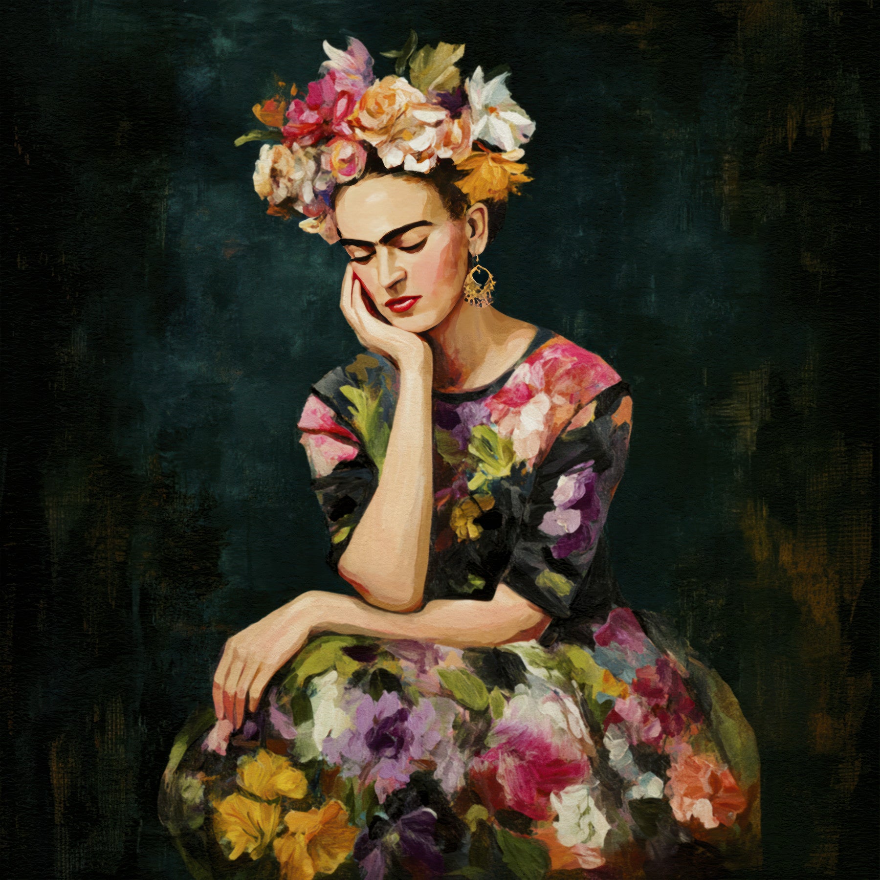 Immerse yourself in this captivating portrait, a modern tribute to an iconic Mexican muse. Her serene expression, framed by a vibrant corona of meticulously rendered blooms, evokes both strength and introspection. Lush, colorful floral patterns adorn her dress, echoing the vivacity of her spirit and the rich cultural tapestry she represents. The dark, textured backdrop heightens the dramatic effect, spotlighting her iconic features and the explosion of floral artistry. A touch of gold in her earrings adds a subtle shimmer, completing this timeless depiction of beauty, resilience, and profound artistic influence. This wallpaper invites a moment of quiet contemplation and celebrates the enduring legacy of a truly unforgettable artist.