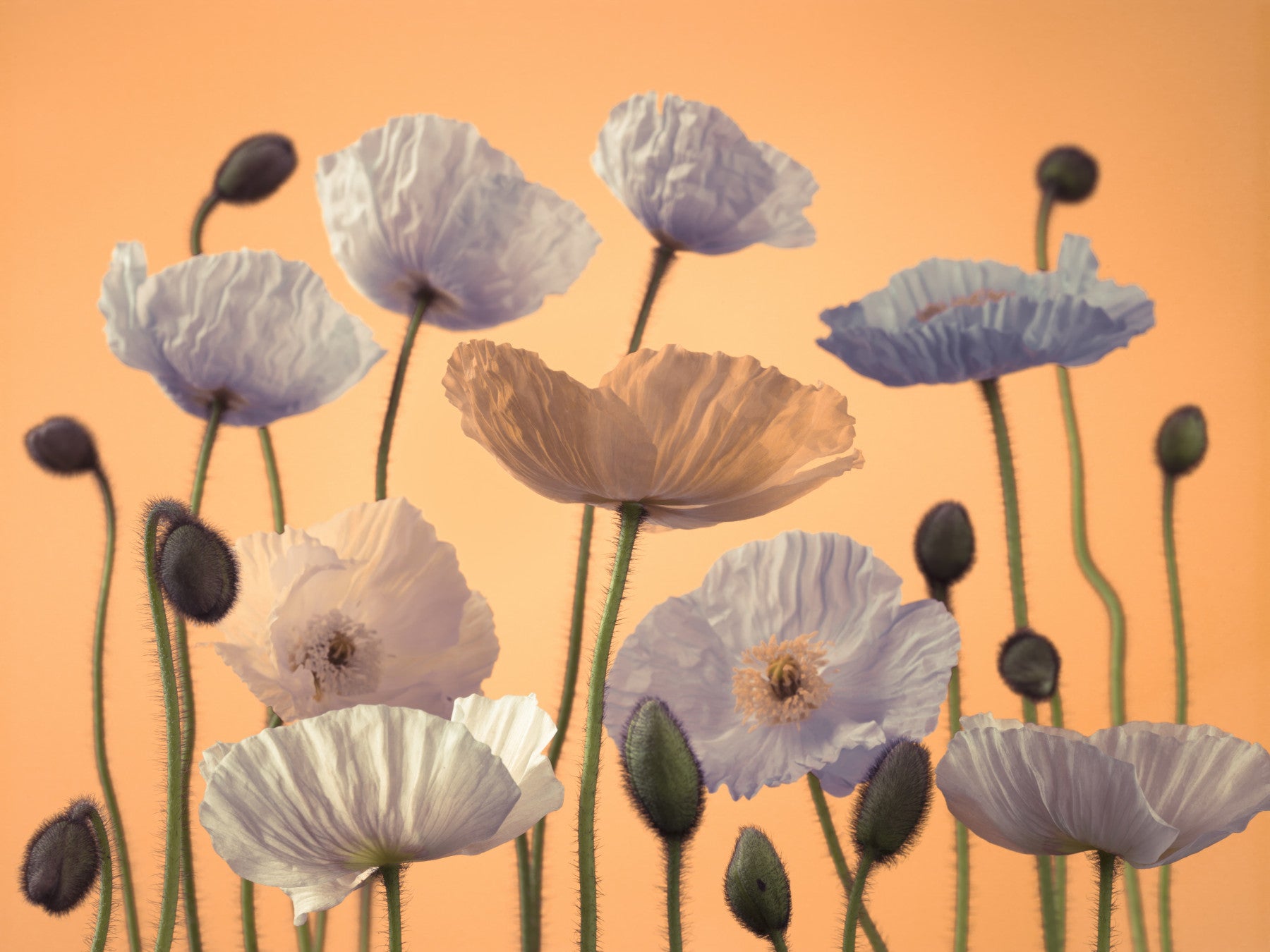 Multi coloured Poppies and buds. Transform any room into a breathtaking botanical garden with "Floral Spectacle". This exquisite wall décor showcases a captivating array of poppies in varying stages of bloom, set against a warm, inviting backdrop. The soft, ethereal hues of the petals – ranging from delicate whites and subtle blues to a warm, peachy tone – create a visually stunning and calming effect. Buds stand tall, promising future blossoms, adding a sense of anticipation and growth. The interplay of light and shadow accentuates the delicate textures of the flowers, giving them a lifelike depth and dimension. Bring the serenity and beauty of nature indoors with this captivating piece, perfect for creating a tranquil and elegant ambiance. Embrace the artistry of nature's grand design with a statement that's sure to enchant anyone who beholds it.