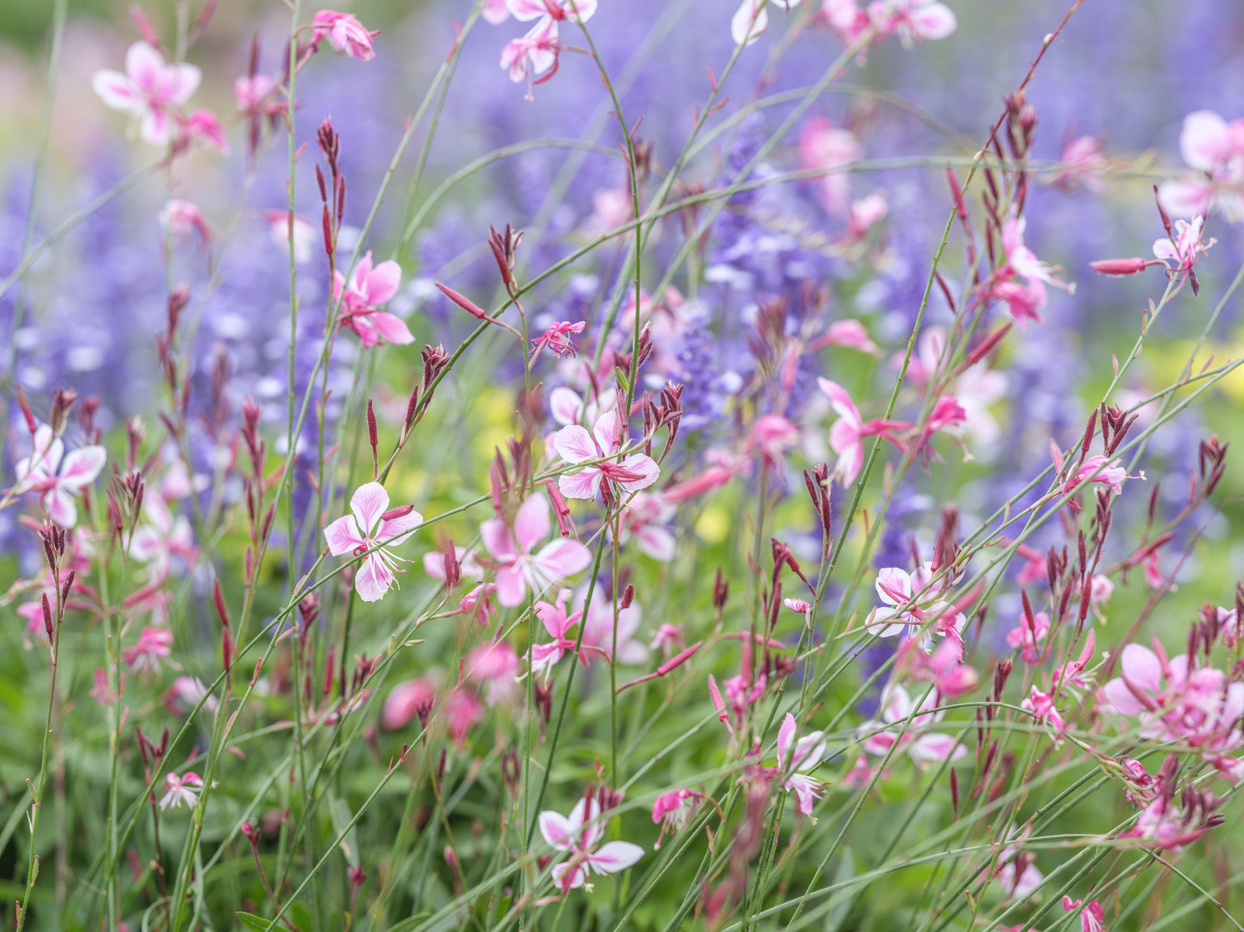 Features a close-up view of delicate pink and white blossoms on slender stems.