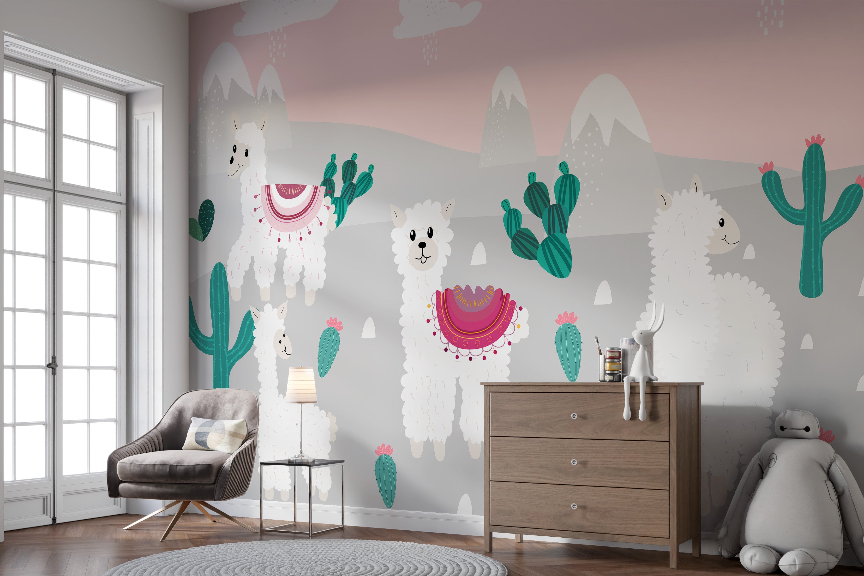 Discover the joyous realm of the Fluffy Fiesta Llama Mural, a captivating nursery wallpaper that brings a cheerful assembly of playful llamas into your little one's room. Each llama, adorned with vibrant, whimsical saddles, stands amidst a magical landscape of soft-hued mountains and lush cacti. The pastel palette ignites the imagination, promising endless stories of adventure at every naptime. This enchanting scene is crafted with care, ensuring a touch of charm and whimsy for a child’s personal haven. Perfect for sparking curiosity and smiles, this delightful nursery wallpaper is a heart-warming addition to the place where dreams begin and the sweetest memories are made.