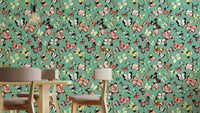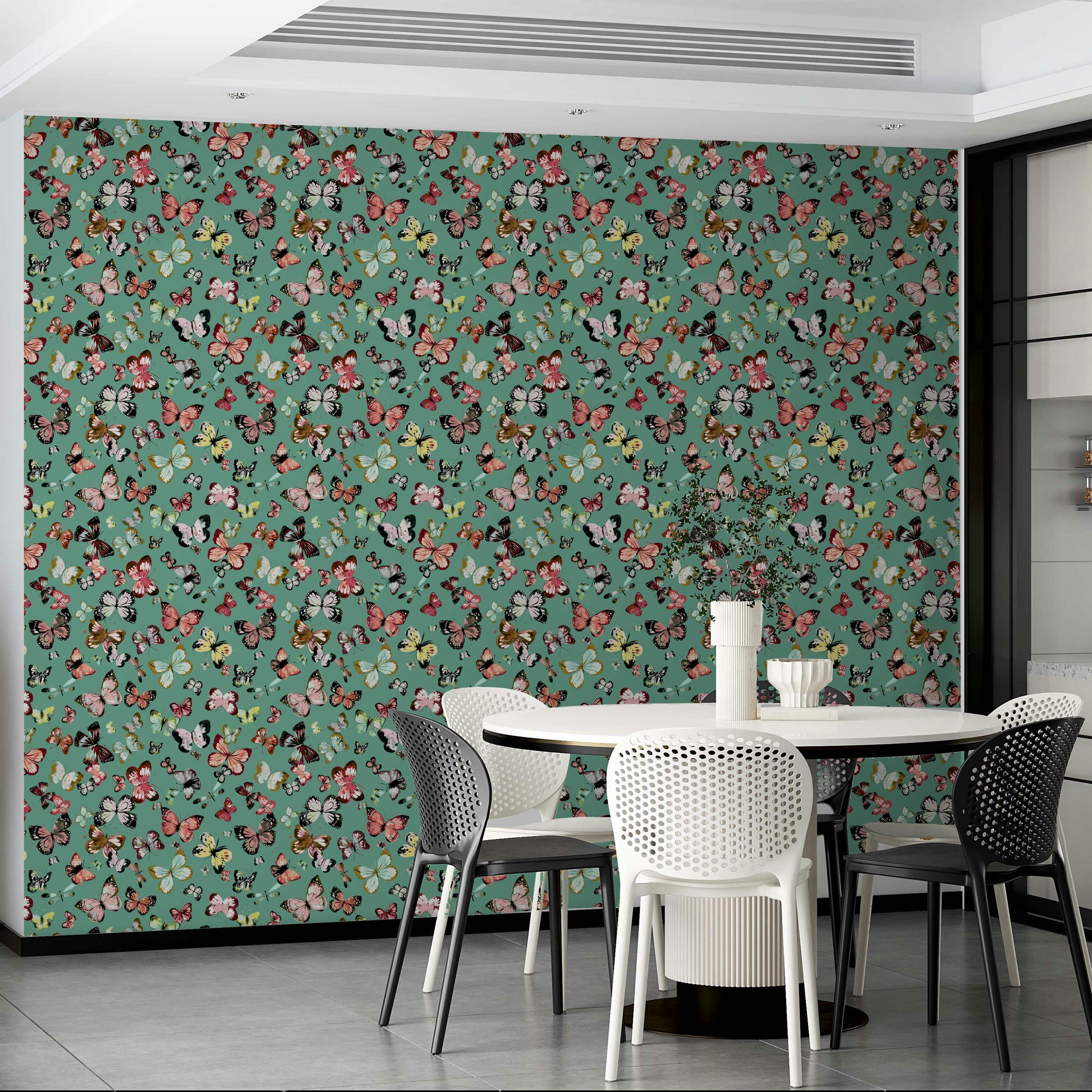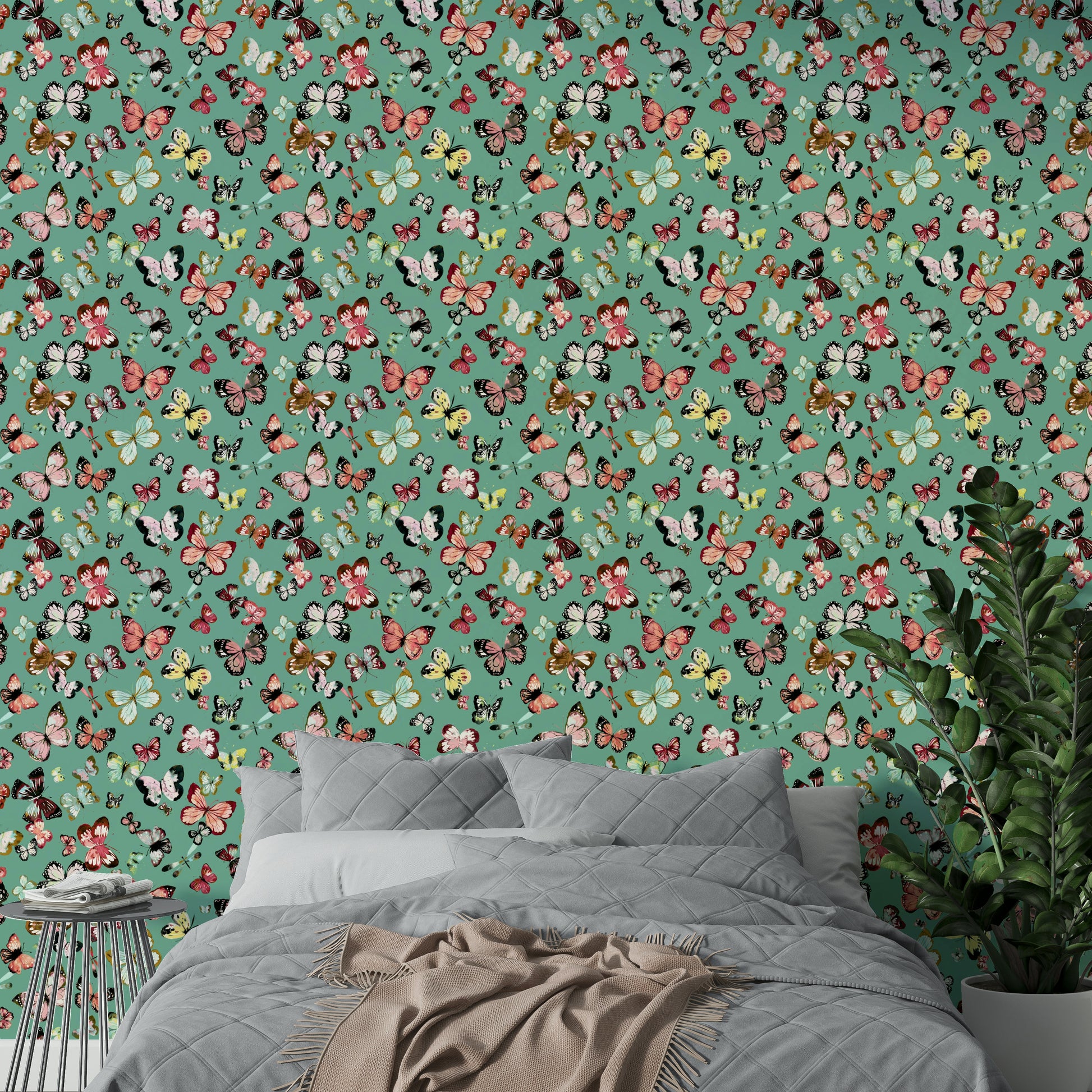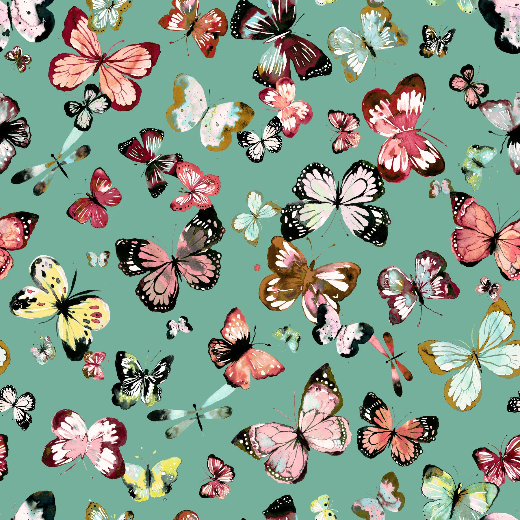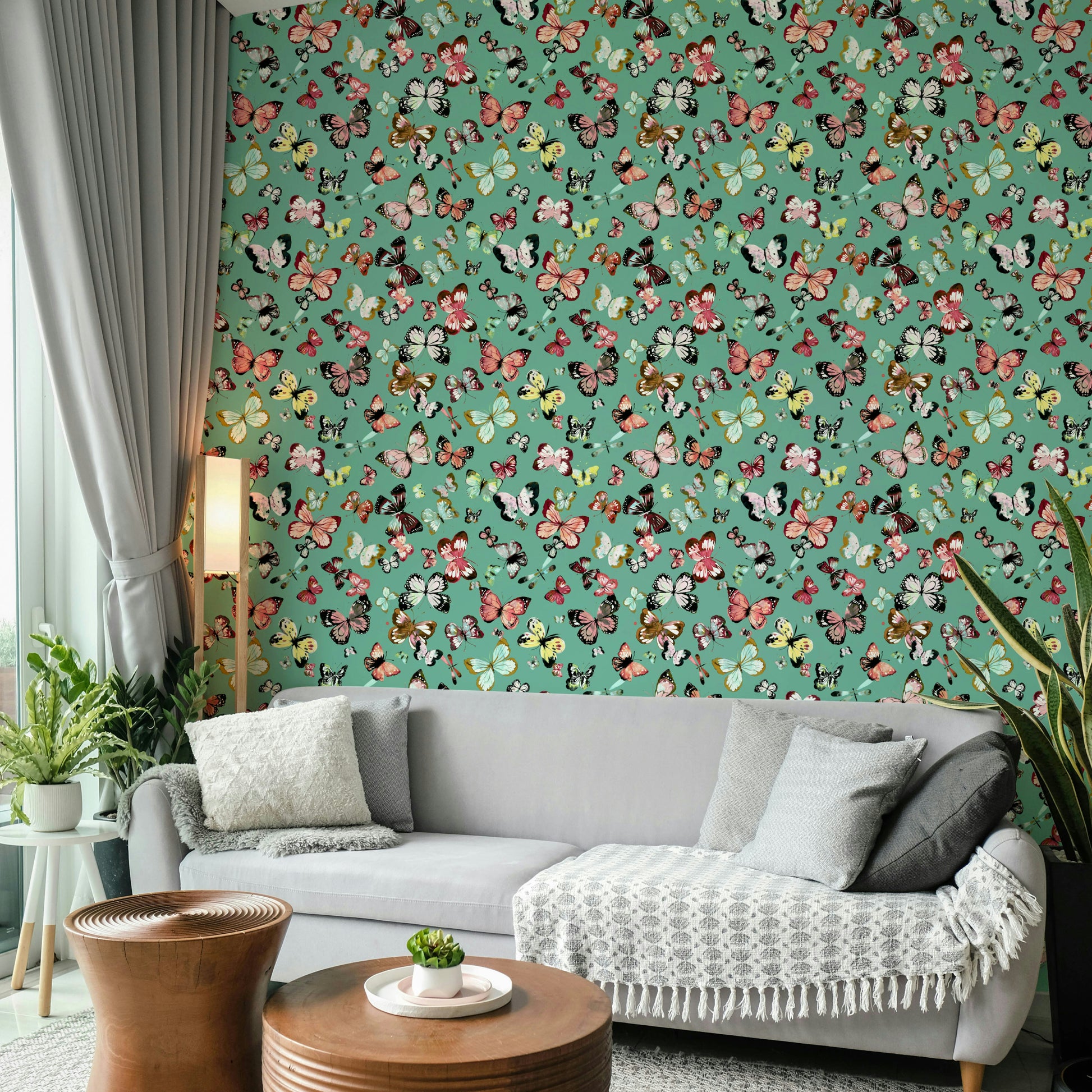 Embrace the serene beauty of this wallpaper, featuring a captivating array of watercolor butterflies in vibrant teal, coral, and a spectrum of other rich colors. Delicate wings flutter across a calming teal backdrop, creating a whimsical and enchanting atmosphere. The diverse butterfly designs, from the largest, show-stopping specimens to smaller, intricate details, add depth and visual interest. A few dragonflies add a touch of unexpected charm, enhancing the sense of a lively, natural world. This wallpaper perfectly blends artistry with tranquility, making it ideal for creating a peaceful and inspiring space.
